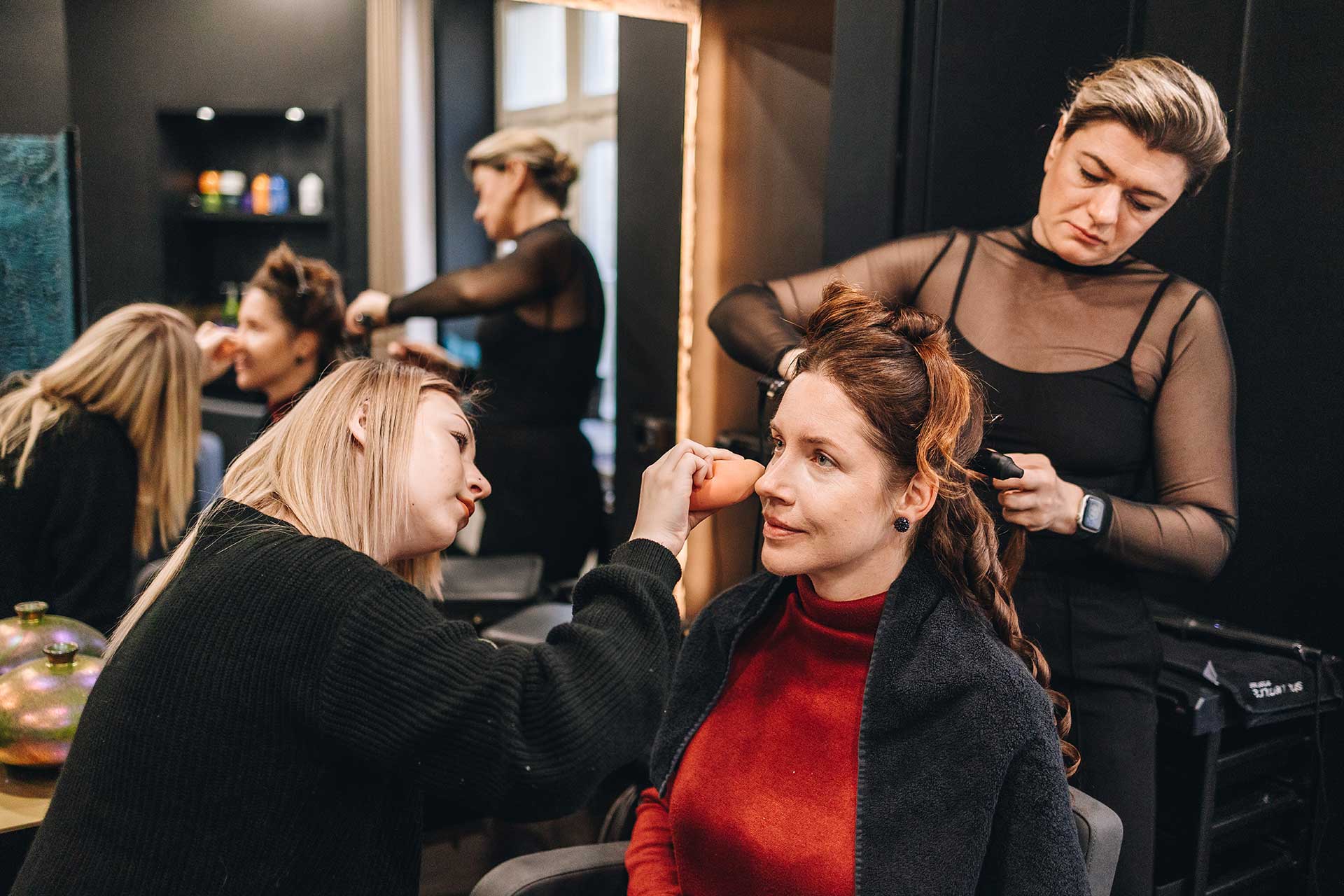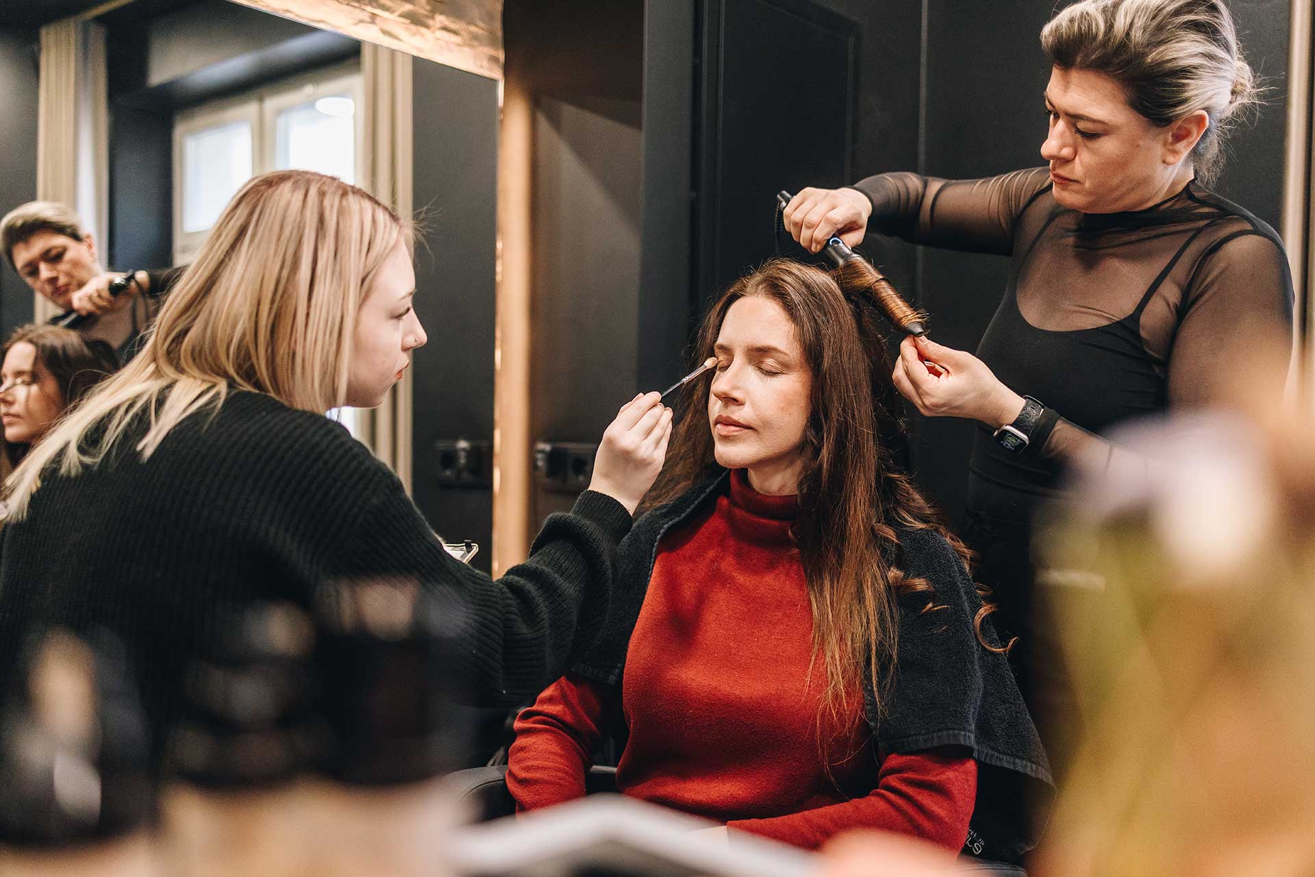 Der Tag startete für Model Zhanna und Shooting-Koordinatorin Sina Meindl bei Haarkult, wo der Look für das Shooting finalisiert wurde. Schnell war klar: Warum sich für eine Frisur entscheiden, wenn man zwei haben kann? Also gab es zuerst Locken, die später locker zusammengesteckt wurden – so konnte Sina im Laufe des Shootings für einen zweiten Style sorgen, indem sie die Haare einfach wieder öffnete.