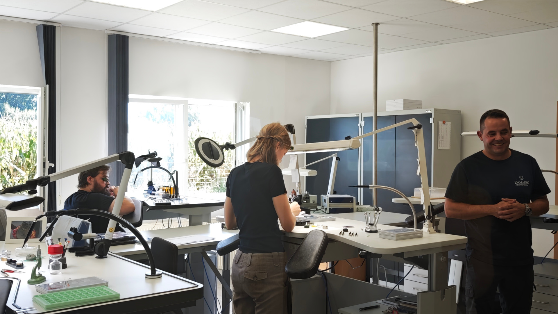 Früher musste man als kleines Unternehmen häufig lange Zeit auf bestimmte Einzelteile, wie Schrauben, warten – also begann Damasko, nach und nach immer mehr selbst herzustellen. Heute arbeiten CNC-Fräser und -Dreher, Industriemechaniker, Fachkräfte für Oberflächenbehandlung, Industriekaufleute, Fremdsprachenkauffrauen, Steuerfachkräfte, Wirtschaftsingenieure und Uhrmacher hier Seite an Seite. Eine vollständig unabhängige, eigenständige Uhrenproduktion ist entstanden. 90 Prozent der Teile fertigt die Firma selbst – vom Gehäuse über Kronen, Drücker und Drehringe bis zu sämtlichen Uhrwerkskomponenten, wie Zahnräder und Stifte. Nur Zifferblätter, Lederbänder, Zeiger, Gläser und Lagersteine kommen von extern. Mit den neuen Aufgabenfeldern wuchs auch das Team von anfangs fünf auf inzwischen 30 Mitarbeiter – darunter sieben Uhrmacher, davon ein Auszubildender.