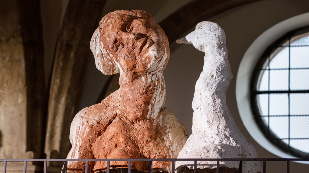 Die Skulpturen, monumental und fragil zugleich, sind nicht nur bloße Vorarbeiten für den Bronzeguss, sondern haben eine ganz eigene Kraft. Die Büsten, zum Teil farbig gefasst, korrespondieren auf den Emporen mit der reichen Ausmalung des Innenraums aus dem 16. Jahrhundert, die weißen Figuren behaupten sich im Zentralraum in ihrer radikalen Materialität und schaffen dabei dennoch eine respektvolle Begegnung mit dem historischen Gotteshaus. Es ist ein Experiment, von dem ein weiterer besonderer Impuls ausgeht. In der Präsentation werden die Entwürfe für die neuen Glasfenster vorgestellt, die Markus Lüpertz für die frühgotische Kirche gestaltet, unter anderem für die prächtige Fensterrose, einem direkten Architekturzitat aus dem französischen Laon.