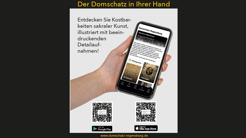 Die Domschatz-App ist in Zusammenarbeit mit der Landesstelle für die nichtstaatlichen Museen in Bayern entstanden, bei der auch eine englische Version herausgebracht wurde. Die App „Domschatz Regensburg“ ist leicht zu bedienen und kann in den gängigen App-Stores sowie über QR-Codes kostenlos heruntergeladen werden.