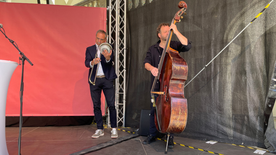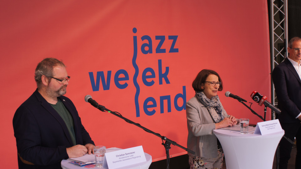 Vorangegangen war ein kleiner musikalischer Gruß. Wolfgang Dersch, Kulturreferent der Stadt Regensburg und selbst federführend am Jazzweekend beteiligt, gab an der Posaune das Stück „On the Sunny Side of the Street" zum Besten. Begleitet wurde Dersch dabei von Uli Zrenner-Wolkenstein am Kontrabass. Wolfgang Dersch lieferte damit das musikalische Motto für das kommende Jazzweekend. Man wolle mit dem Festival Leben und Glück in die Stadt bringen und Menschen helfen, die es gerade nicht so leicht haben, so Dersch.