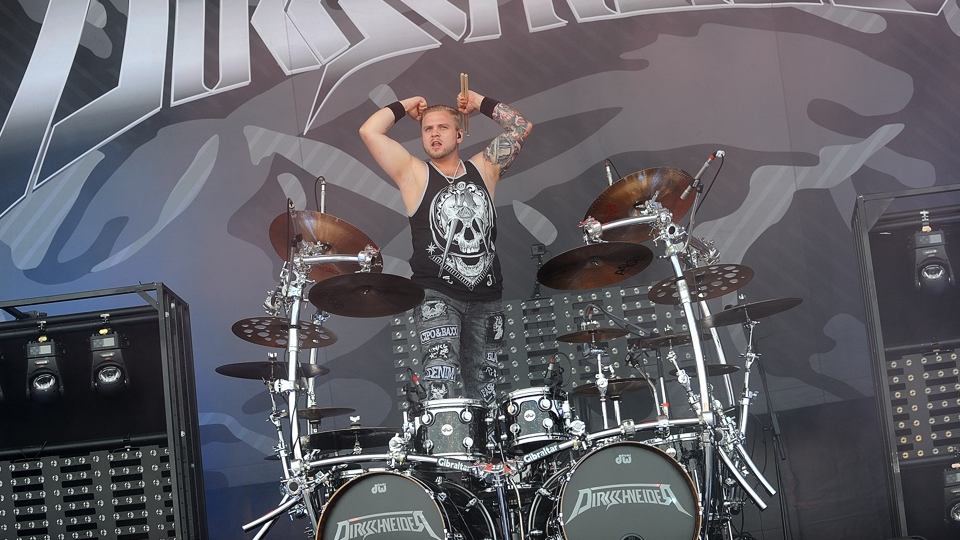Dirkschneider Junior hat sichtlich Spaß bei den Live Touren mit seinem Papa.An dem Abend habe ich mich mit Biff (Anm. d. Red. Peter „Biff“ Byford, Sänger der Band Saxon) unterhalten und ihm mein Leid geklagt. Ich meinte damals noch, dass die Suche nach einem Schlagzeuger nicht so einfach wäre, auch wegen der Art Musik die wir machen und er meinte nur „Wieso? Ich kann dir da einen empfehlen!“ Darauf wollte ich natürlich wissen wen und er antwortete nur ganz trocken „Ja, deinen Sohn!“ Ich dachte natürlich erst, er meinte das als Scherz, aber es war ihm wirklich ernst. Er meinte dann noch, dass unsere Bands sich musikalisch ziemlich ähnlich sind und Sven unser Material zu 100 Prozent spielen kann. Dann habe ich meinen Sohn natürlich gefragt, ob er sich das vorstellen könnte und er hat jetzt nicht direkt ja gesagt. (lacht) Ich glaube er hat dann wirklich fast einen ganzen Monat überlegt. Ich hatte mich eigentlich schon damit abgefunden, dass er nicht bei uns einsteigen wollte, da stellte sich heraus, dass Sven in dem Monat wie ein verrückter geprobt hatte, um am Ende sagen zu können „Ja, okay, kann ich machen!“ Seitdem sitzt er bei mir hinter dem Schlagzeug. Wir haben ein tolles Verhältnis, das ich eher als freundschaftlich bezeichnen würde. Mittlerweile schreibt er sogar mit mir die Texte und macht einen Höllen-Job am Schlagzeug. Der Junge ist da richtig reingewachsen und es macht ihm, denke ich, auch richtig Spaß.