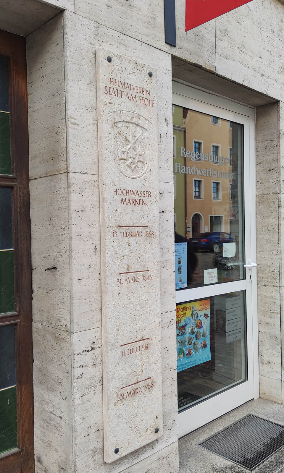 Wenn man an Leben in Stadtamhof denkt, bleibt ein weiteres Thema nicht aus: Hochwasser. „Ich kann mich noch sehr gut an das Hochwasser 1988 erinnern, da stand in der Marien-Apotheke einen halben Meter hoch das Wasser. Es gab noch keine Kanalisation und so kamen der ganze Dreck und Schlamm herein. Um das zu verhindern, stellte man Sandsäcke vor die Eingangstüren, sodass das Wasser zumindest etwas klarer in die Gebäude kam“, schildert Prischenk. Reil bestätigt, dass Hochwasser auch schon früher immer Thema in Stadtamhof gewesen sei und das nicht nur einmal im Jahr. „Dazu kam noch der Eisstoß, der das Wasser gestaut hat und dann ist bis in den Mai das angespülte Eis gestanden“, erklärt Reil. Das Pylonentor – das direkt hinter der kuchenbar aufragt und das Ende der zentralen Straße durch Stadtamhof markiert – wurde dann mit Brettern verrammelt. So konnte man zwar das Wasser nicht immer abwehren, aber zumindest die Eisschollen. Reil hat auch positive Erinnerungen an das Hochwasser: „Wir Jungs hatten es damals immer schön, wenn Hochwasser war – weil dann keine Schule war“, blickt er lächelnd zurück. An der Hausmauer des Gebäudes in der Hauptstraße Nummer 17 ist sogar eine Hochwassermarke angebracht. Das Anfang der 90er Jahre am Gries installierte Schöpfwerk und der mobile Hochwasserschutz an der Wassergasse und am Franziskanerplatz bieten heute einen verbesserten Schutz, jedoch noch nicht den angestrebten Schutz für ein 100-jähriges Hochwasser.