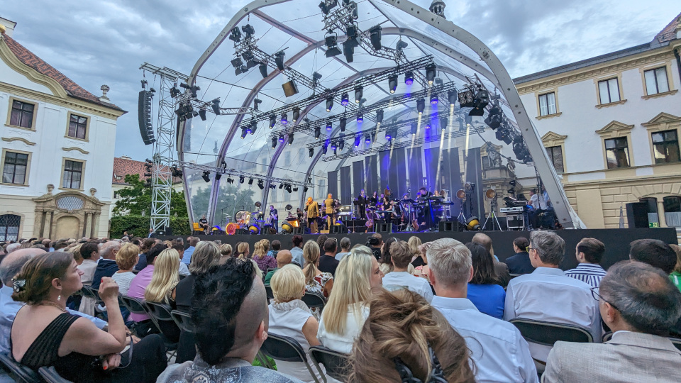 Zwischenzeitlich war es etwas frisch geworden und der Himmel etwas dunkel über Regensburg, doch die Stimmung im Inneren des Schlossparks ließ sich davon keineswegs trüben. Besonders nicht, als kurz nach halb Neun die ersten Musiker die Bühne des Innenhofs betraten. Die ursprünglich dreiköpfige Band Alphaville um Sänger Marian Gold hat sich für ihre aktuelle „40th Anniversary Symphonic Tour“ einiges an Verstärkung geholt und die größten Songs der Band seit Bestehen auf ein großes Orchester ausgeweitet. Eine Idee, die sicher schon mehrere Künstler hatten, die aber nicht für jeden „Sound“ gleich gut funktioniert.
