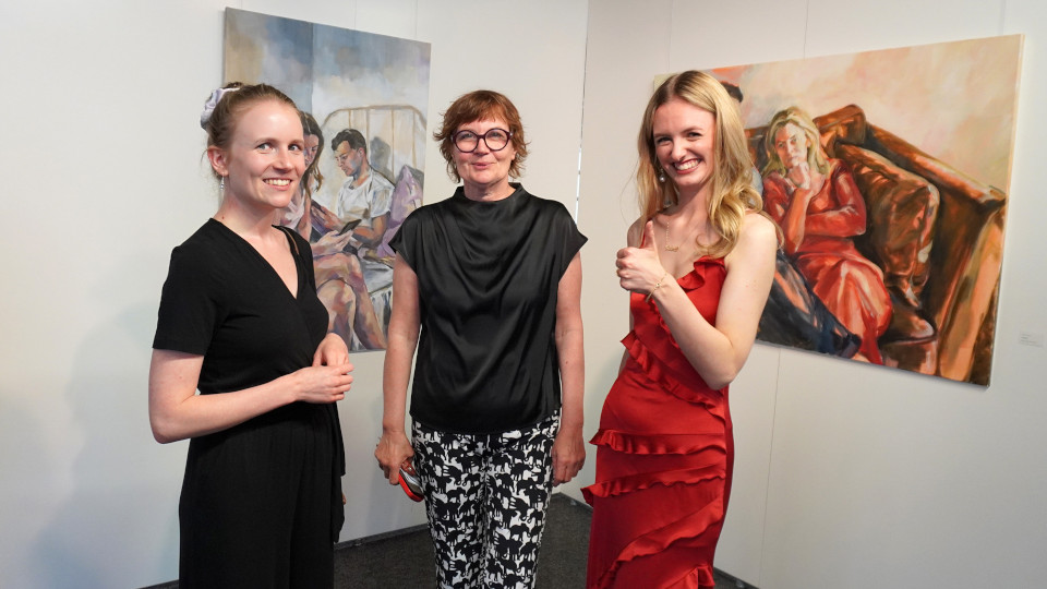 Prof. Dr. Birgit Eiglsperger von der Universität Regensburg freut sich mit den Studentinnen Mirjam Jahn und Fabiola Sagorni über ihre gelungene Ausstellung. Der Masterstudiengang „Bildende Kunst und Ästhetische Erziehung“ an der Universität Regensburg war für die zwei Studentinnen sehr bereichernd, da sie viele Einblicke in die künstlerischen Prozesse bekommen haben. Durch diesen Studiengang und ihre Abschlussprüfung haben die zwei Studentinnen eine eigene Ausstelltung mit dem Titel „Under the Surface" auf die Beine gestellt. Die Ausstellung ist öffentlich und kann vom Monatg, den 08. Juli, bis einschließlich Donnerstag, den 11. Juli, besichtig werden.