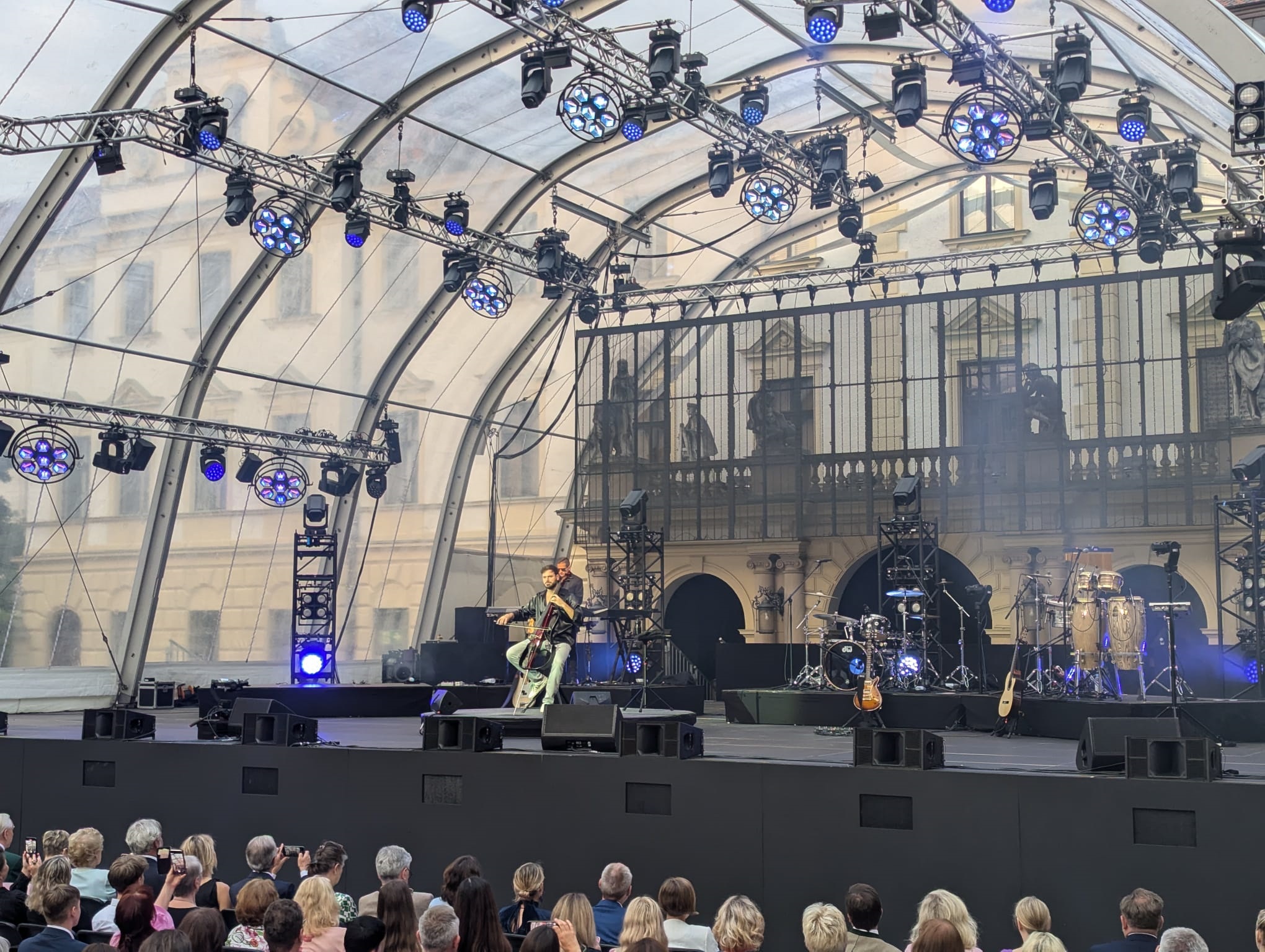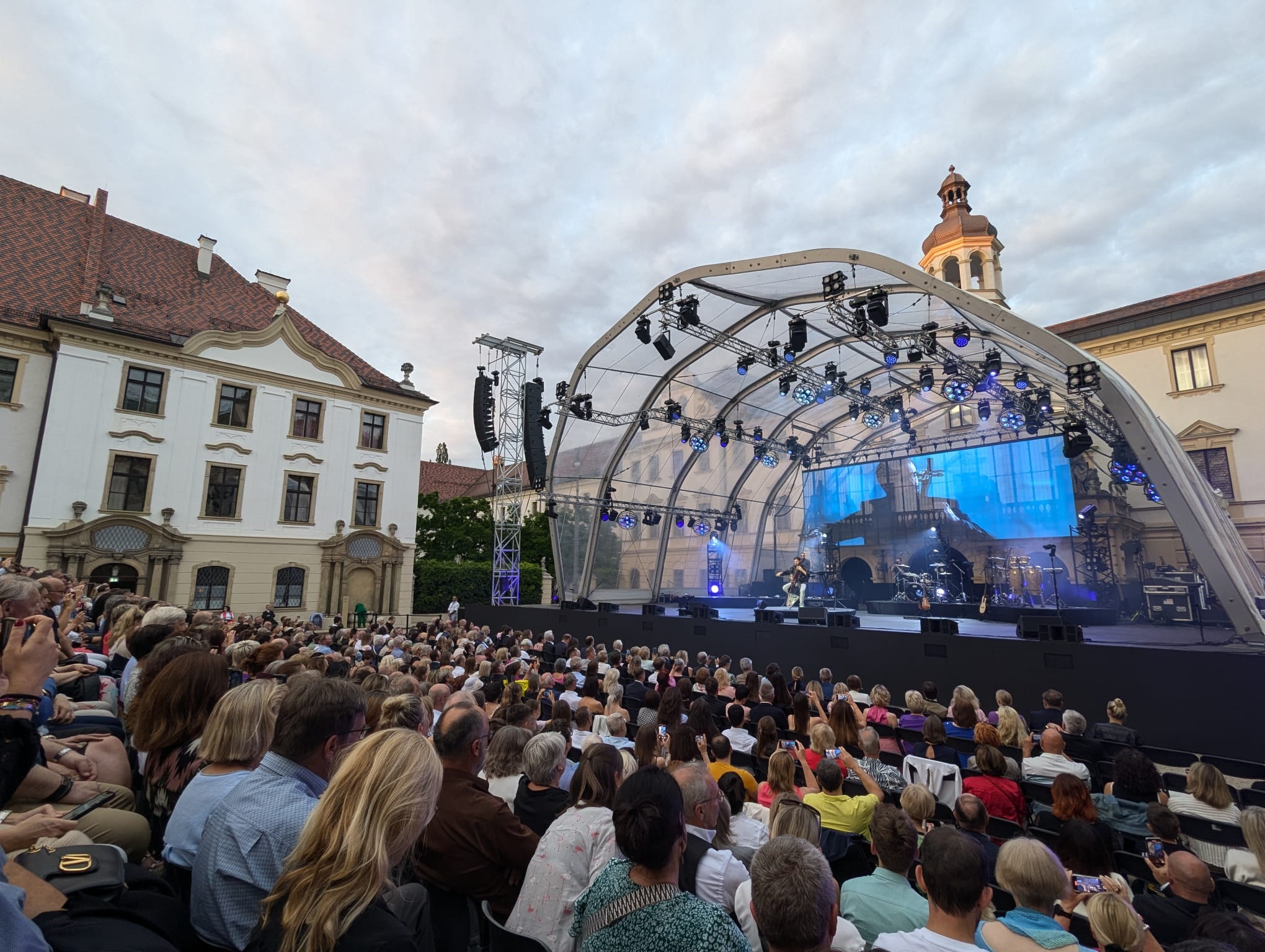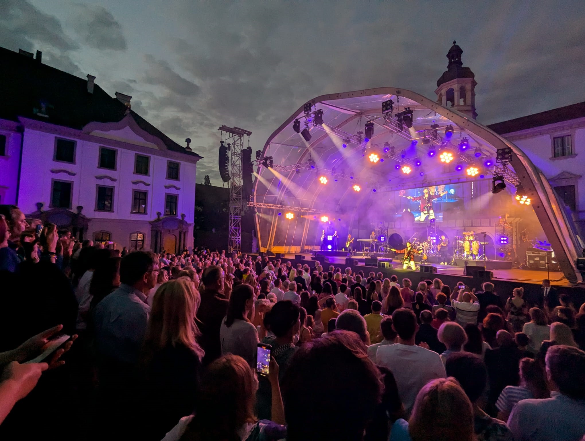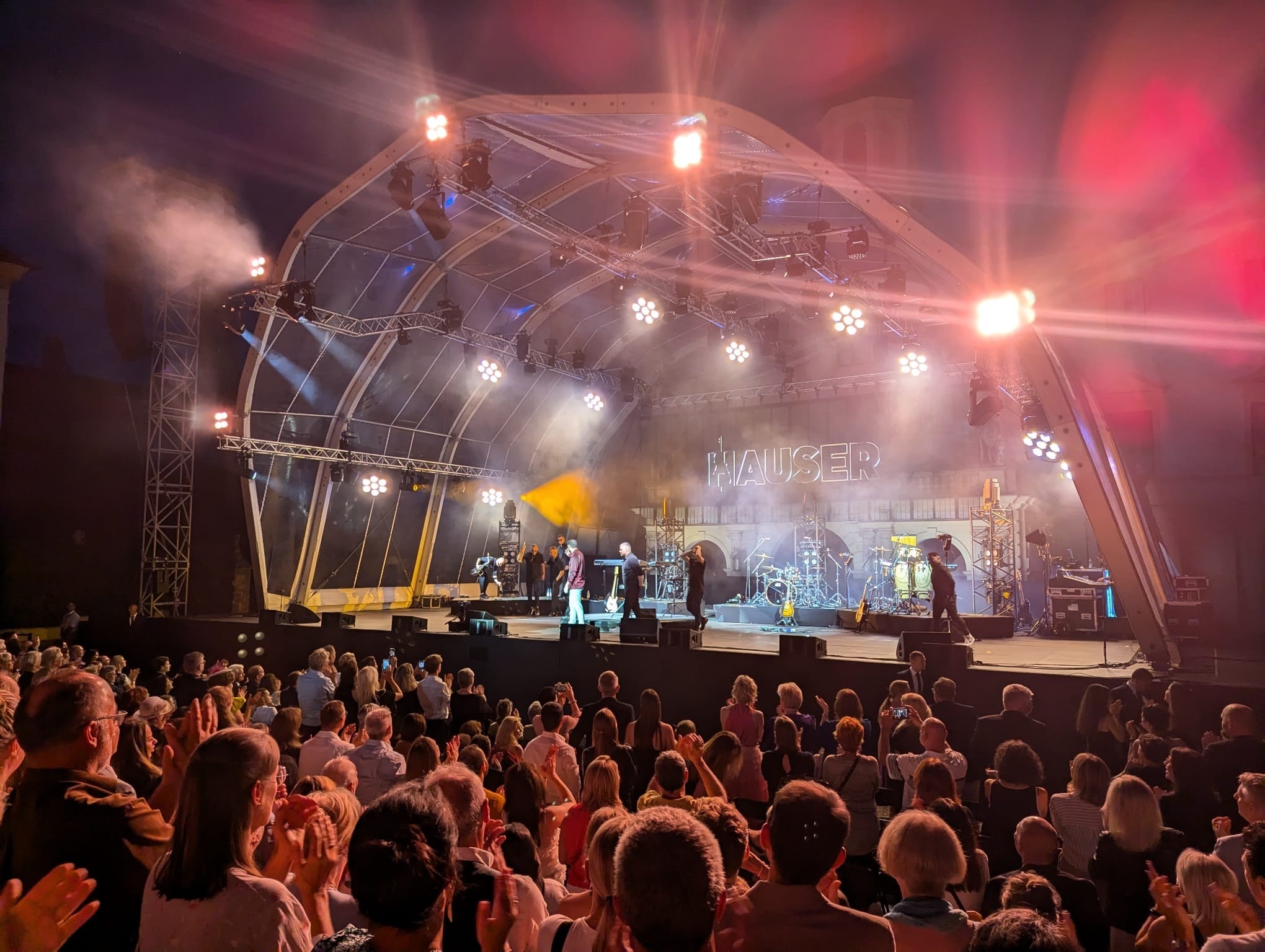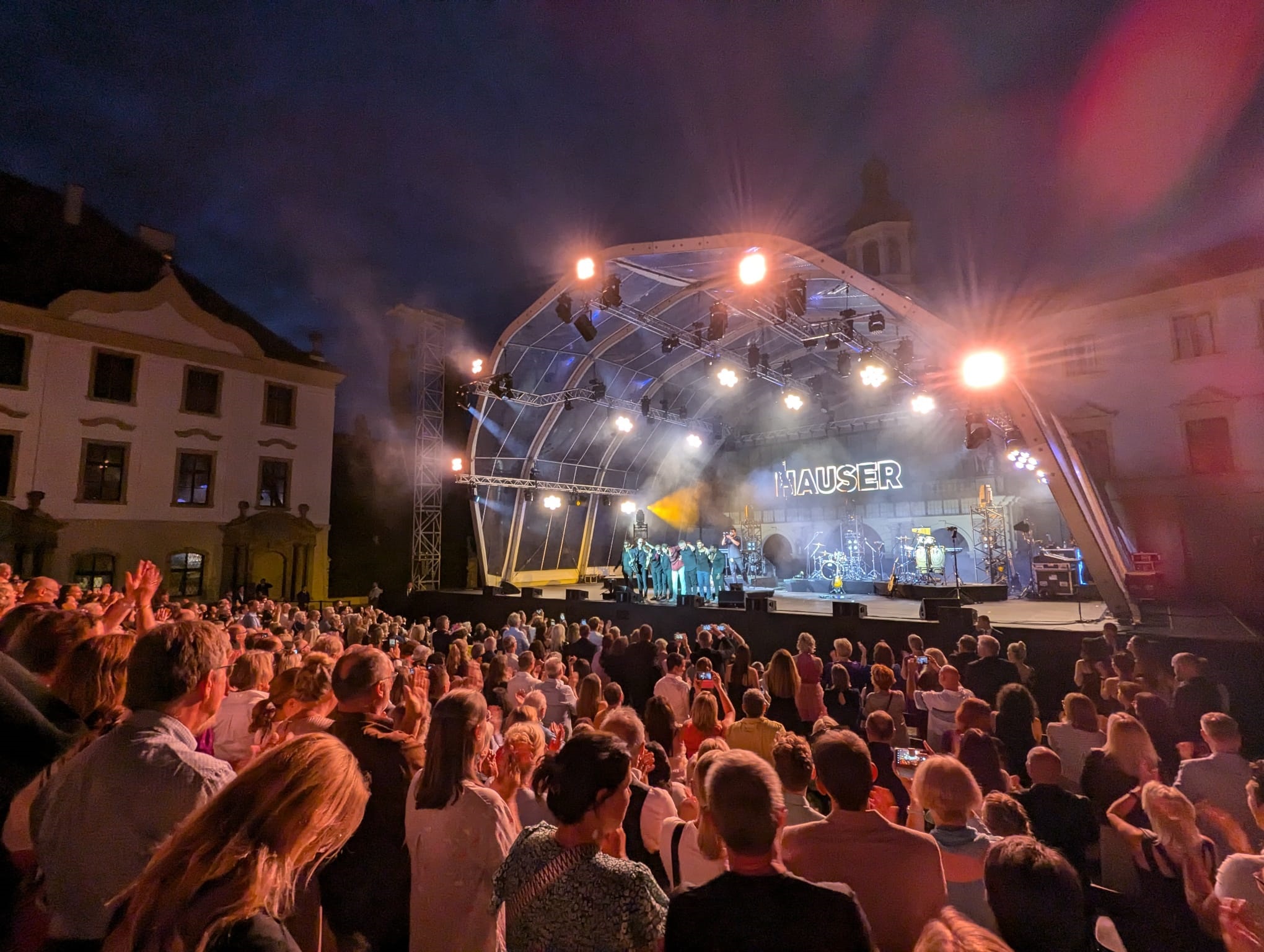 Nachdem sich alle auf ihren Plätzen in der großartigen Kulisse des Innenhofs von Schloss Thurn und Taxis eingefunden hatten, startete HAUSER seine Performance. Ruhige, klassische Klänge stimmten die Zuschauerinnen und Zuschauer an diesem traumhaft milden Sommerabend auf das Konzert ein.
