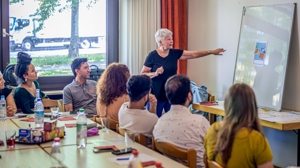 Die Sprachcafés konzentrieren sich vor allem darauf, den Wortschatz der Teilnehmenden zu erweitern. Da bei jedem Treffen ein neues Thema behandelt wird, können Interessierte jederzeit in die Gruppe einsteigen. Heute stehen Redewendungen auf dem Programm: Das Sprichwort „Zu viele Köche verderben den Brei“ löst eine lebhafte Diskussion aus, da viele der Anwesenden ähnliche Ausdrücke aus ihrer Muttersprache kennen. Nebenbei werden Rezepte aus verschiedenen Ländern gleich mit ausgetauscht, denn die Vorfreude auf das gemeinsame Essen nach drei intensiven Unterrichts-stunden ist groß.