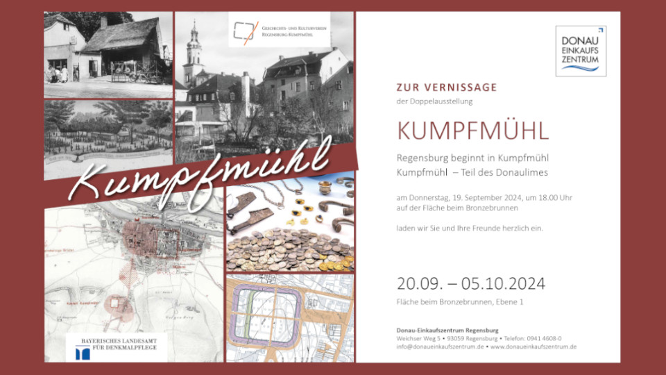 Unter dem Motto, „Regensburg beginnt in Kumpfmühl“, nehmen der Geschichts- und Kulturverein Regensburg-Kumpfmühl e.V. und das Bayerische Landesamt für Denkmalpflege die Besucher mit auf eine Reise zu den Ursprüngen der Siedlung am Donaulimes und zeigen in zwei unabhängigen aber dennoch zusammenhängenden Ausstellungen die Geschichte des Stadtteiles.