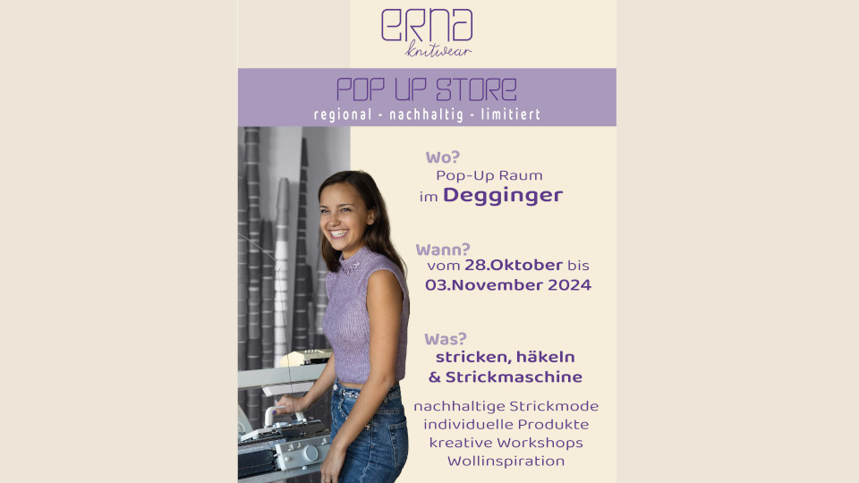 Der ernaknitwear Pop-Up Store öffnet im Degginger seine Türen. Es gibt dort hochwertige, nachhaltig produzierte Strickwaren, die in limitierten Auflagen regional auf der Handstrickmaschine gefertigt werden. Neben einer ausgewählten Kollektion an Strickprodukten besteht die Möglichkeit, ein individuelles Strickstück aus einer großen Auswahl an Wolle selbst zusammenzustellen.