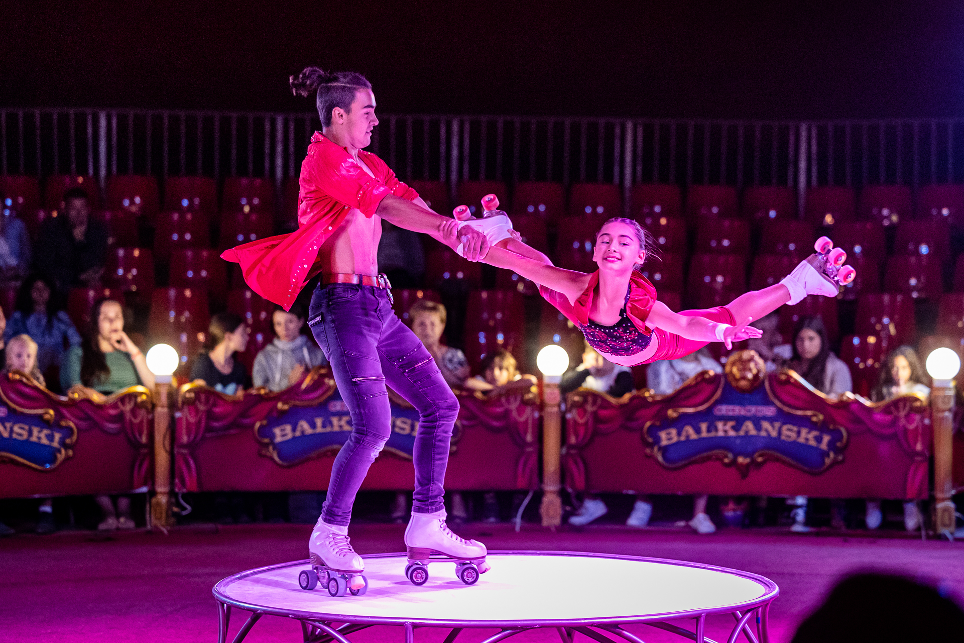 Zum „Runterkommen“ bei so viel Nervenkitzel gibt es viele magische Momente. Die Kunst von Arzuman Arutyunyan aus Armenien ist sozusagen ein offenes Buch: Plattform für seine Hand-Balancen sind leuchtende, aufgeschlagene Buchseiten. So konzentriert wie er in den Handstand geht, wirbelt Sergio Paolo kleine Bälle durch die Luft –und sich selbst dazu. Der Chilene gehört zu den Star Jongleuren der Circuswelt. Seine Spezialität: er jongliert kleine Bälle nicht nur in der Luft und Richtung Boden, was man Bouncing nennt, –spielend leicht gelingt ihm dazwischen auch noch ein Rückwärtssalto! Mit den Kräften der Bewegung spielen auch die Youngsters des Weihnachtscircus. Tiziano, Mary und Nataly Balkanskiaus Bulgarien wirbeln auf Rollschuhen über eine kleine runde Plattform. Es wird geflogen und gestemmt, gedreht und verdreht, dass förmlich die Funken fliegen. Da wird so manchem ein Licht dazu aufgehen, was es bedeutet, „Star in der Manege“ zu sein.