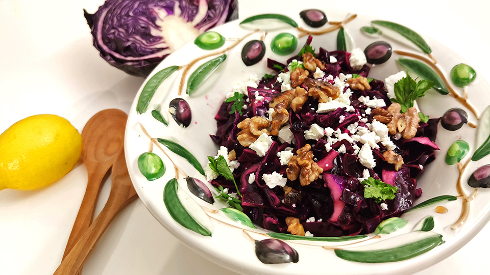 - Zum Anrichten eine Portion Rotkohl auf den Teller geben, den Schafskäse darüber krümeln und mit den Nüssen garnieren.