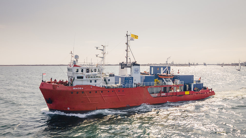 Das Rettungsschiff SEA-EYE 4 wurde von der sogenannten libyschen Küstenwache bedroht und aufgefordert, „lybisches Territorium“ zu verlassen. Das Kriegsschiff umrundete die SEA-EYE 4 für 50 Minuten.