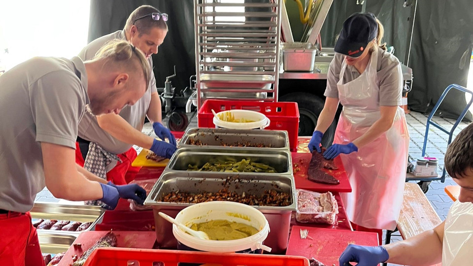 „Wir legen großen Wert auf gutes Essen. Es muss nicht immer nur Eintopf aus der Feldküche kommen. Neben den Klassikern wie Schnitzel, Braten und Currywurst gibt es auch verschiedene Nudelvarianten, die wir gerne zubereiten. Wir berücksichtigen bei der Auswahl der Speisen auch die körperliche Belastung der Helfer je nach Einsatzlage“, berichtet Björn Fiebig, Lehrgangsleiter und Chefkoch der Nürnberger Feldküche. „Am Sonntag gab es Rinderrouladen und Borschtsch.“