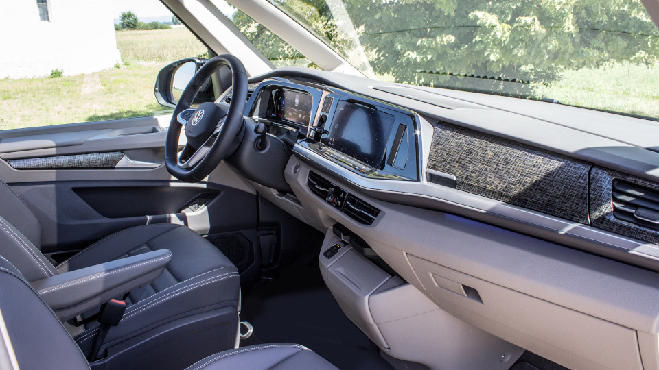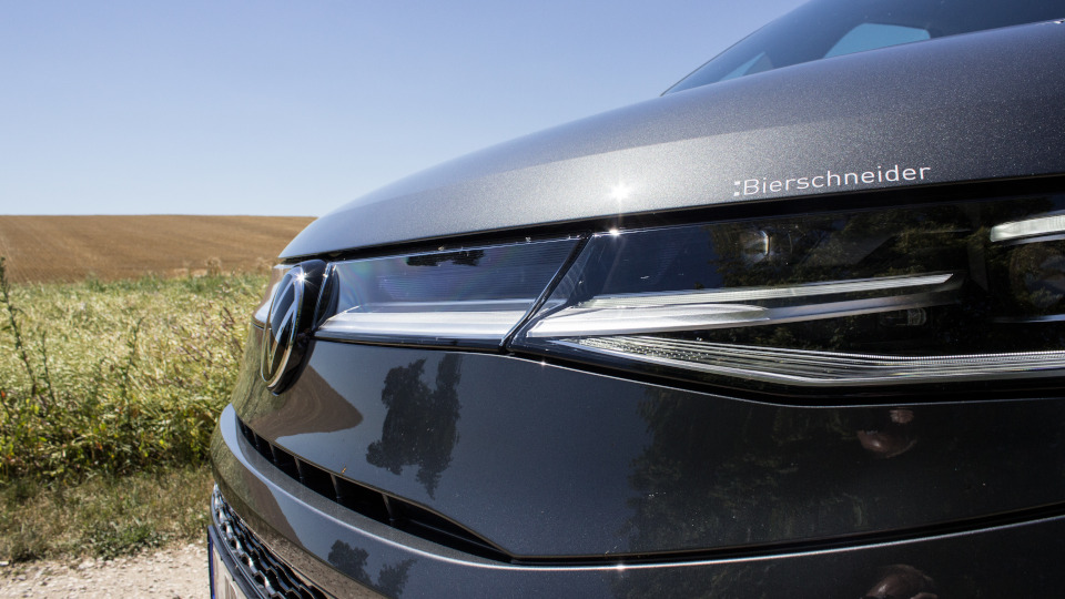 Es ist High Noon, als wir den T7 in der Nutzfahrzeugabteilung beim Autohaus Bierschneider in Regensburg abholen. Die Sonne steht fast noch an ihrem höchsten Punkt im Jahr, einen Monat nach dem längsten Tag. Und da der Sommer der Sonne hinterherfährt, peitscht nun eine Hitzewelle durch der Welt schönste Region – die Oberpfalz. Das bemerkt auch die Klimaanlage und schaufelt erstmal mächtig durch. Graue Haut, massives Panoramadach, viel Raum, viel Fläche – das heizt. Aber die gute Dämmung schafft sowohl angenehme Ruhe bei der Fahrt als auch ein wohl temperiertes Inneres. Einmal runtergekühlt, säuselt die Klima nur noch sanft vor sich hin. Businessclass.