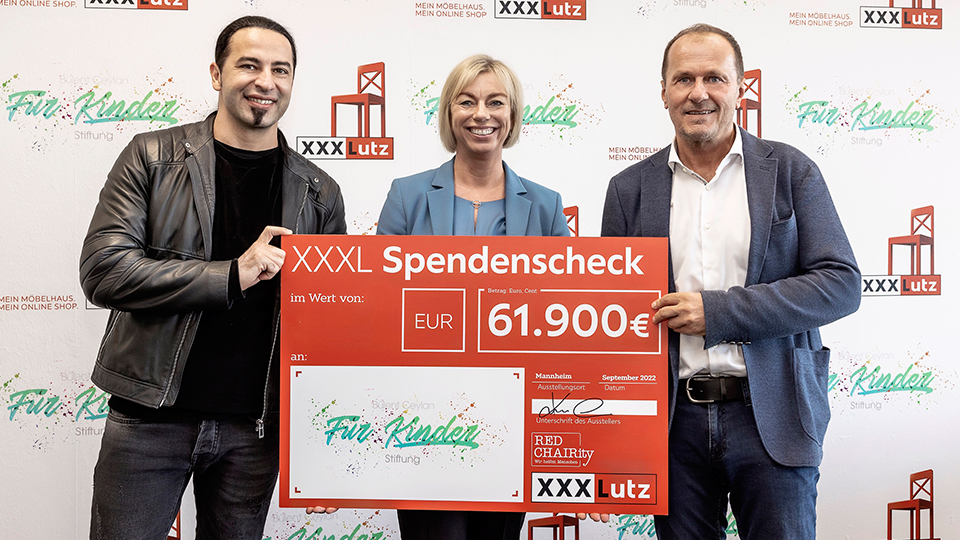 Strahlende Gesichter bei allen Beteiligten, weil es Comedian Bülent Ceylan zusammen mit der XXXLutz Unternehmensgruppe gelungen ist, genau den Kindern ein Lächeln ins Gesicht zu zaubern, die nicht auf der Sonnenseite des Lebens stehen: Mit einer großen und bis dato in dieser Form einmaligen Malaktion hatten die XXXLutz Möbelhäuser bundesweit Kinder dazu aufgerufen, ihr ganz eigenes Bild zu malen, wie sie auf dem Roten Stuhl wohnen. Pro eingesandtem Bild hatte XXXLutz eine Spende in Höhe von 100 Euro an die „Bülent Ceylan für Kinder Stiftung“ versprochen – und auch Wort gehalten: Denn jetzt nahm der erst vor wenigen Tagen mit dem Deutschen Fernsehpreis ausgezeichnete Comedian am Weltkindertag den XXXL-Scheck im Mannheimer Möbelhaus mit dem Roten Stuhl aus den Händen von Alois Kobler, CEO bei XXXLutz Deutschland, entgegen – und herausgekommen ist die beeindruckende Spendensumme von sage und schreibe 61.900 Euro. Absender der Spende ist mit „RED CHAIRity“ die Hilfsorganisation der XXXLutz Unternehmensgruppe, die sich um die Umsetzung der gemeinnützigen Projekte kümmert und so seit 2010 auf ganz unterschiedliche Art und Weise weltweit humanitäre Hilfe leistet.