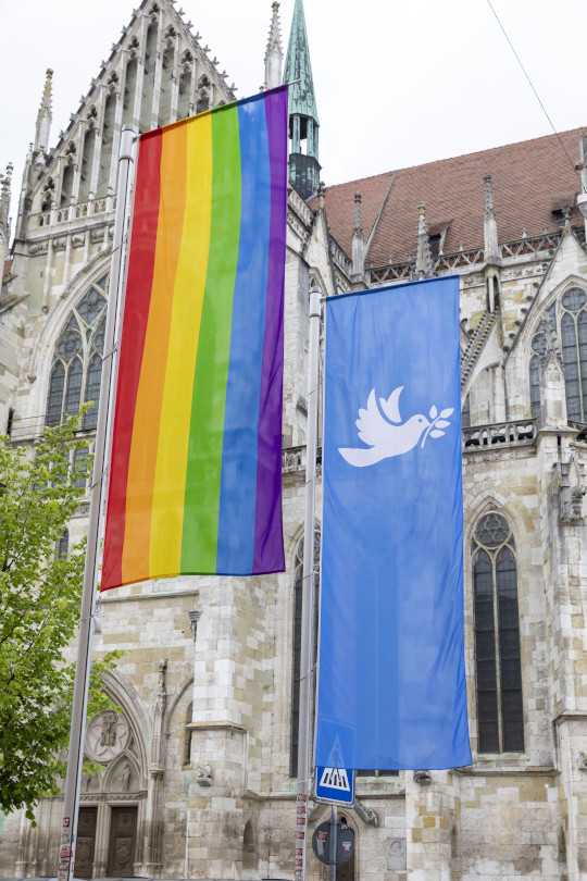 Um ein Zeichen für mehr Gleichberechtigung, aber auch Frieden für alle Menschen – unabhängig von ihrer sexuellen Orientierung und Geschlechtsidentität – zu setzen, hängt am Regensburger CSD-Wochenende auf dem Domplatz neben der Regenbogenfahne auch eine Fahne mit einer Friedenstaube. Die Fahnen hat die Städtegruppe Terre des Femmes Regensburg der Antidiskriminierungsstelle zur Verfügung gestellt.