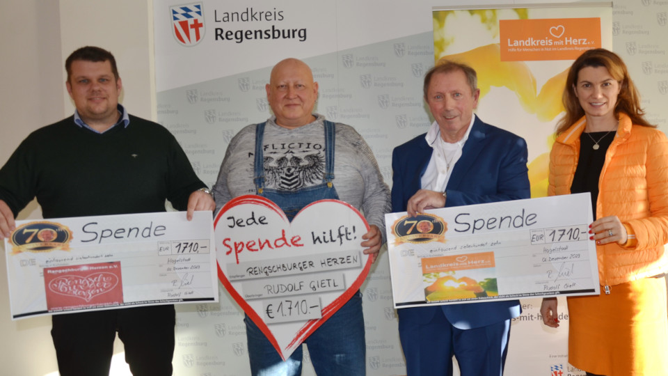 Die Vereine Landkreis mit Herz e.V. und Rengschburger Herzen e.V. können sich über eine großzügige Spende freuen. Rudolf Gietl aus Hagelstadt, der zuletzt als Werkleiter im Siemens Gerätewerk Amberg tätig war, hat anlässlich seines 70. Geburtstages auf Geschenke verzichtet und stattdessen um Spenden gebeten. Bei seiner Feier im Gasthaus Schwarzer Adler in Pfakofen mit Verwandten, Freunden und ehemaligen Arbeitskollegen sind viele Gäste seinem Wunsch gefolgt und so kam die stolze Summe von 3 420 Euro zusammen. Die erzielten Spenden hat der Jubilar nun mit jeweils 1 710 Euro an Landkreis mit Herz e. V. und die Rengschburger Herzen e.V. übergegeben.