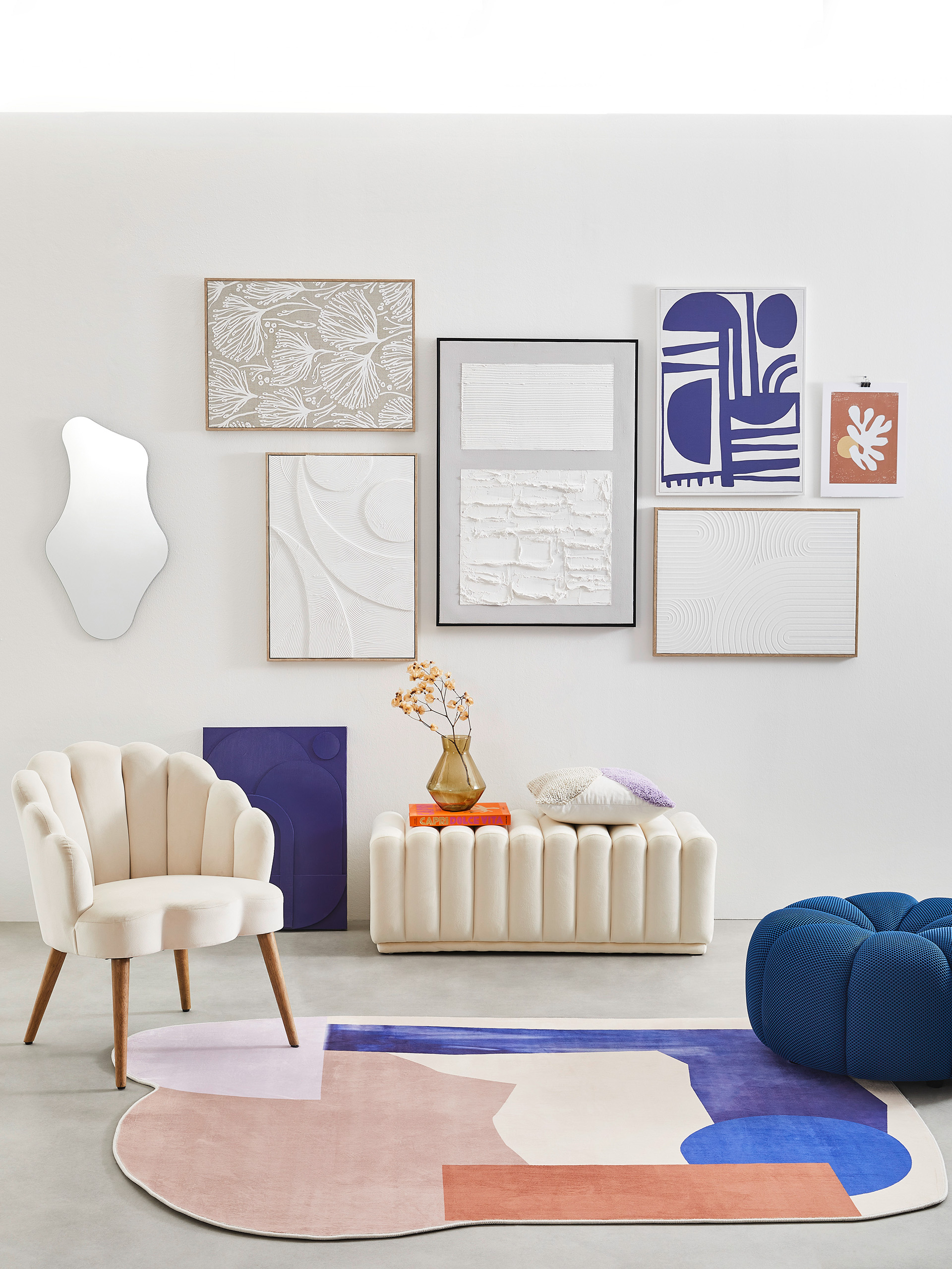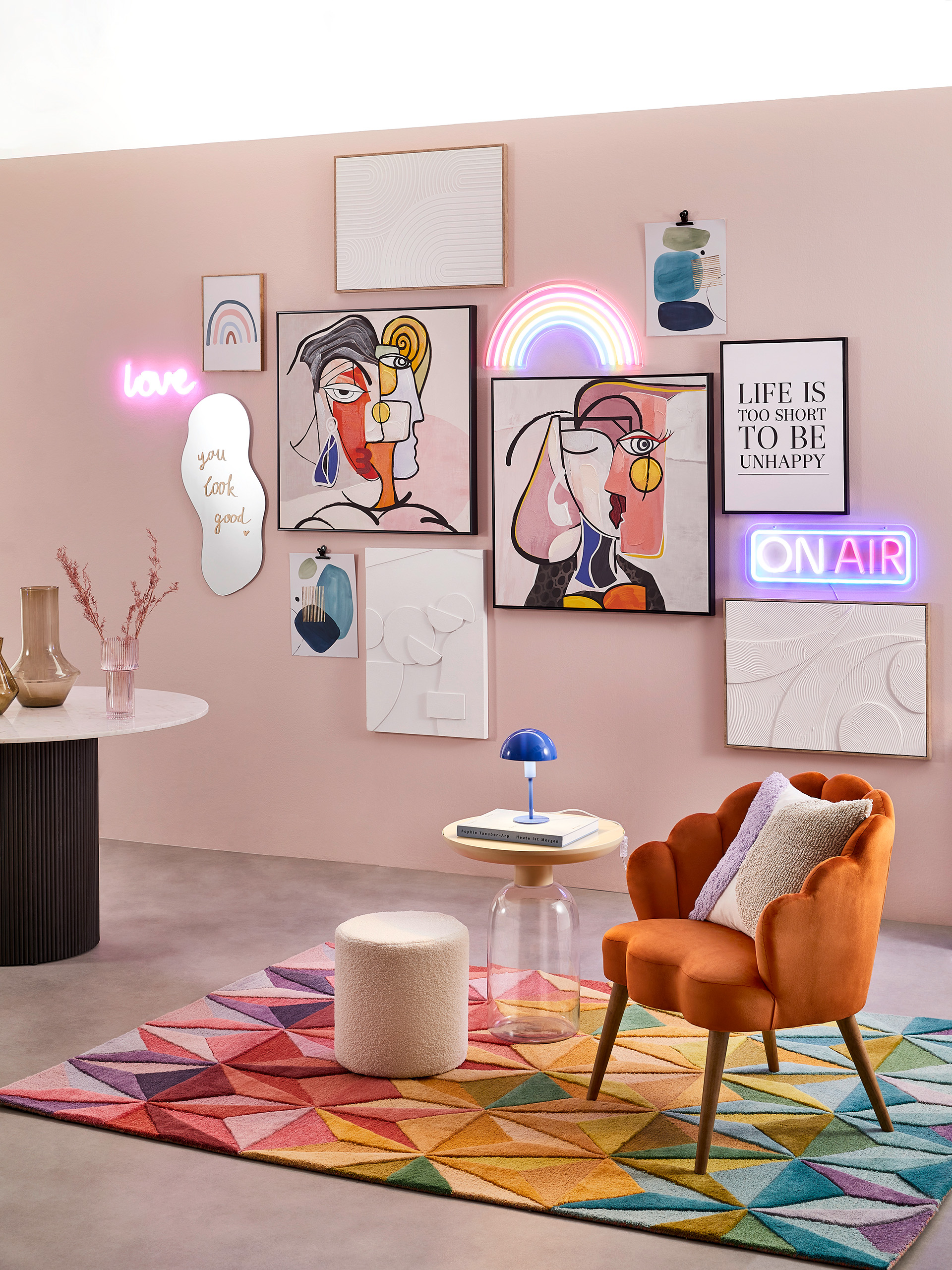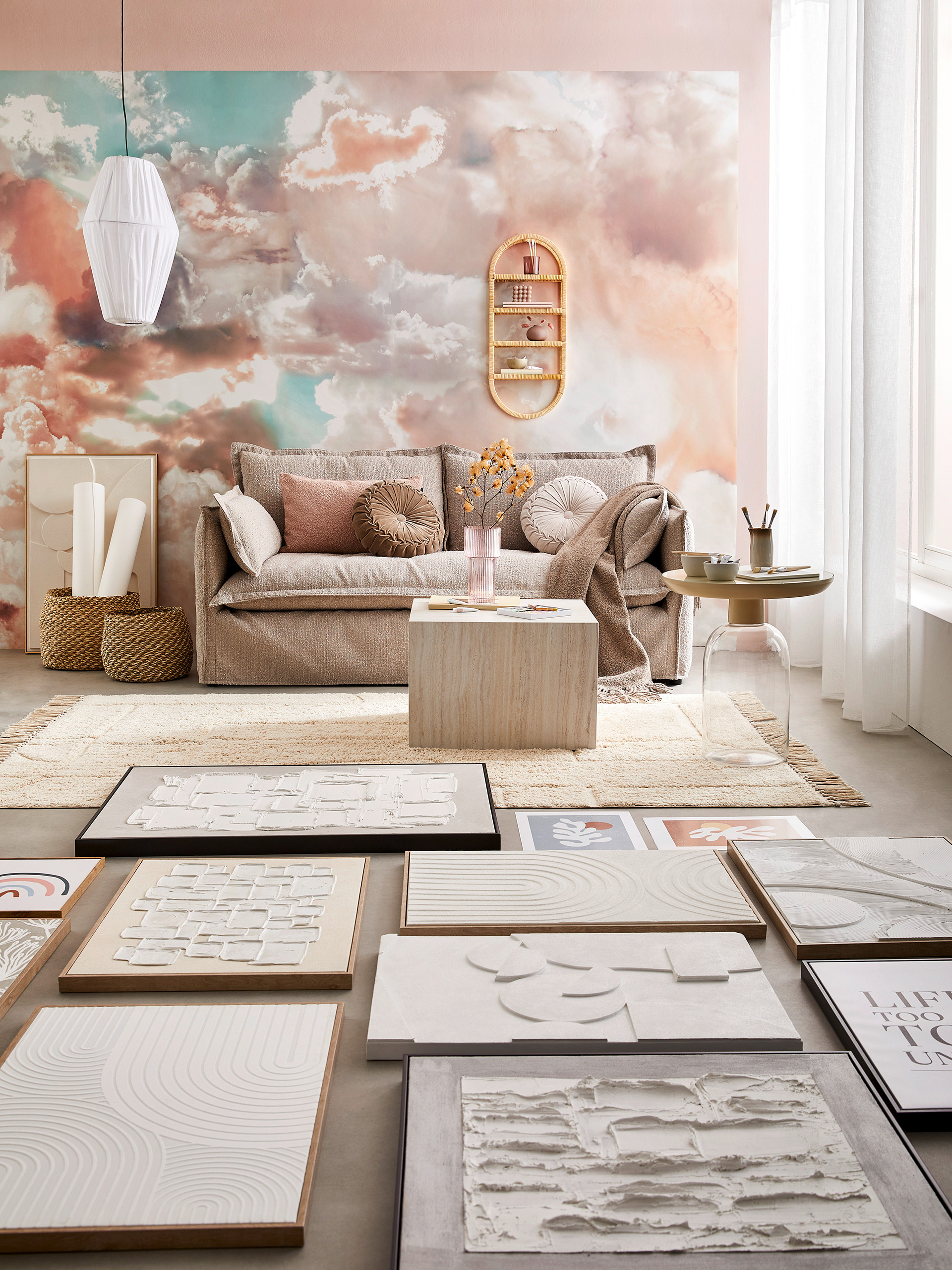 Im Fokus der trendigen Kollektion stehen Gemälde in einer Vielzahl an Designs und Größen. Dazu gehören handwerklich anmutende Bilder, florale Muster sowie kontrastierende grafische Zeichnungen und Kunstdrucke. Kombiniert werden die Bilder mit Schriftzügen, leuchtender Wanddekoration und Spiegeln in organischen Formen, die ein einzigartiges Ensemble ergeben. Für einen besonders harmonischen Eindruck kommen passende Accessoires wie Leuchten, Vasen oder Wohntextilien zum Einsatz, die Muster und Farben der Wandkunst aufgreifen und den Wohnraum in ein echtes Künstler-Atelier verwandeln.