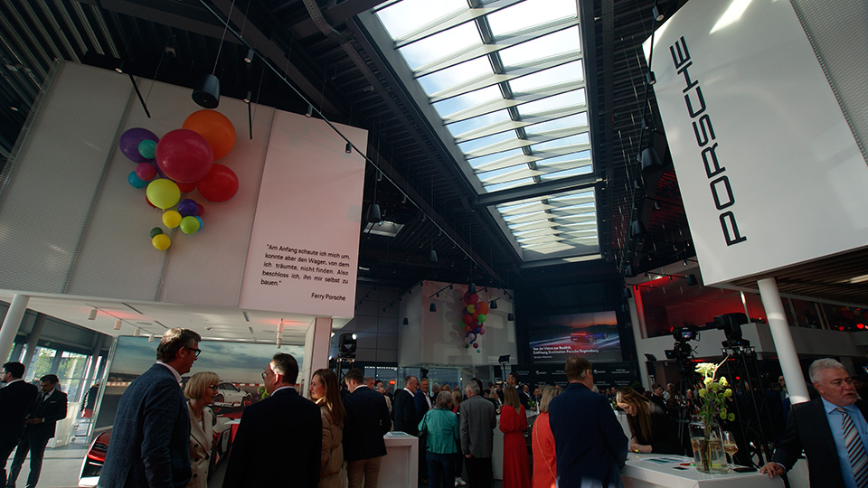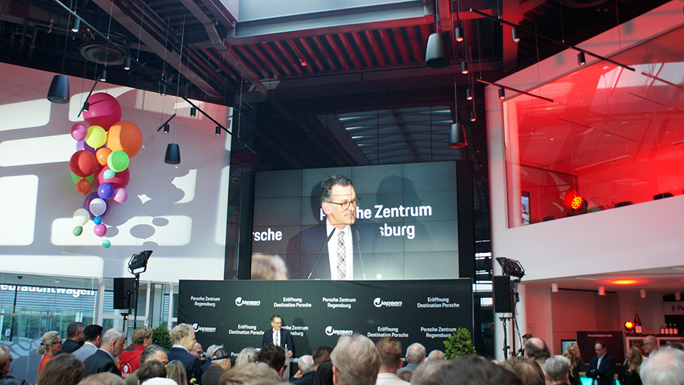 TV-Moderatorin Evi Reiter führte durch den Abend, der mit einem kurzen Film über die Geschichte der Marke Porsche eingeleitet wurde. Als erster Redner stand Johannes Marx, Geschäftsführer der Jepsen Automobilhandelsgesellschaft, auf der Bühne – unglaublich stolz über das Erreichte kündigte er an: „Die Marke Porsche soll ihre Strahlkraft weit über die Grenzen Regensburgs hinaus entfalten.“