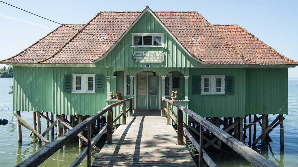 Ein besonders schöner architektonischer Schatz liegt am bayerischen Ufer des Bodensees. Das Badehaus in Lindau-Aeschach lädt schon seit Anfang des 20. Jahrhunderts an heißen Tagen zur willkommenen Abkühlung ein. Ende der 1970er Jahre wurde das drohende Aus des Badehauses durch den Protest einer Bürgerinitiative verhindert – heute fühlt sich ein Ferientag auf dem Sonnendeck des lindgrünen Pfahlbaus wie eine Zeitreise an.