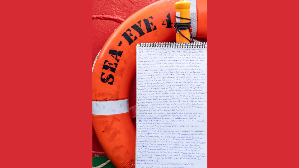 Ein Abend im Oktober 2024 auf dem Mittelmeer – zwei Tage nachdem die „SEA-EYE 4“ 22 Menschen vor dem Ertrinken gerettet hatte, verschwindet der Überlebende Hussein* in den Schutzräumen des Schiffs. Nichts Besonderes, er wird sich schlafen legen. Doch wenig später kommt er wieder – mit einem Brief in der Hand, verfasst in schöner arabischer Schrift. Er ist der Crew gewidmet. Tags darauf ist er auf Englisch übersetzt. Und an Deck fließen die Tränen: