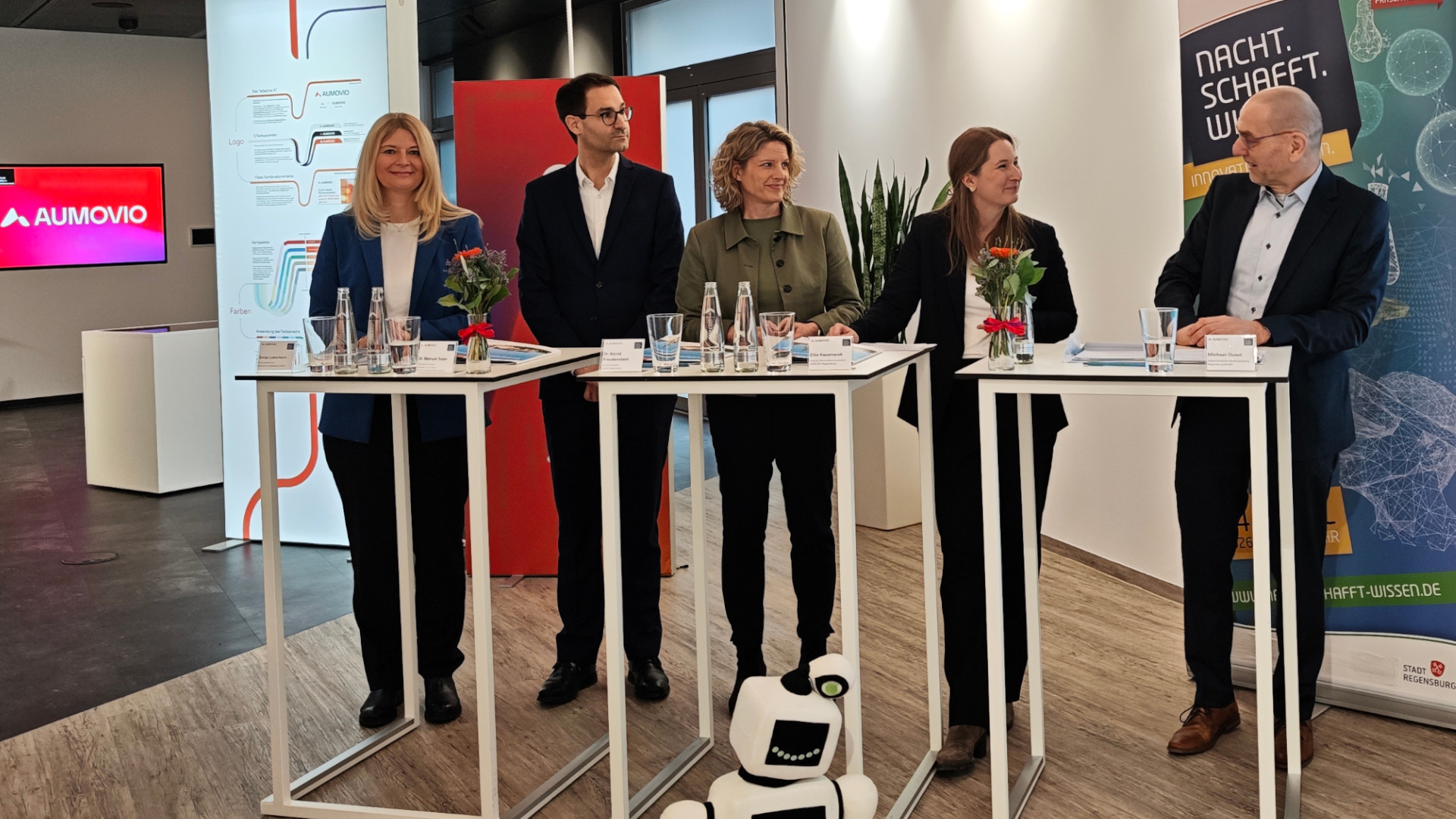 Sonja Leberkern, Geschäftsführerin der Starkstrom-Gerätebau GmbH, Dr. Manuel Sojer, Executive Director Business Unit Power der Maschinenfabrik Reinhausen, Bürgermeisterin Dr. Astrid Freudenstein, Elke Kaczmarek, Leitung Standortkommunikation von AUMOVIO Regensburg, Michael Quast, Geschäftsführer der Stadtmarketing Regensburg GmbH (v. li.).