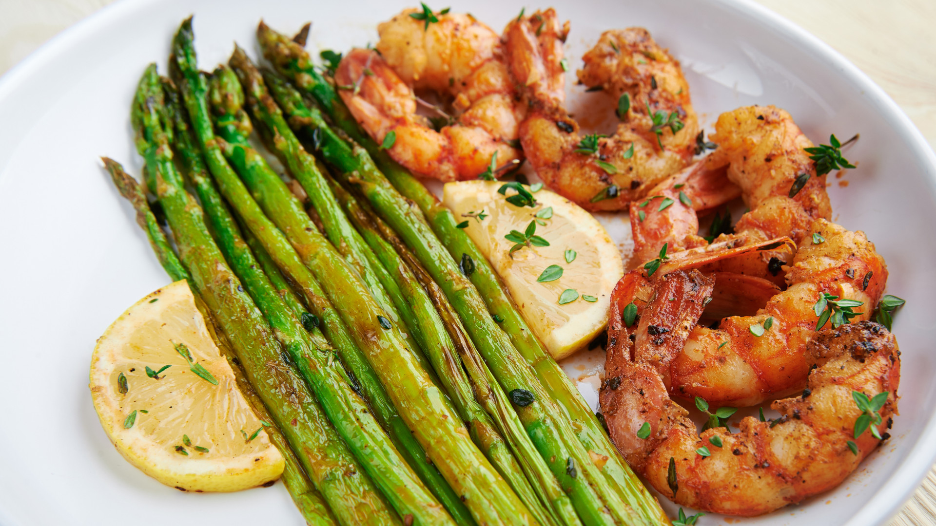 Grüner Spargel im Pistazien-Mantel mit Ricotta-Zitronen Dip, Honig-Chili-Garnelen & Lavendelöl