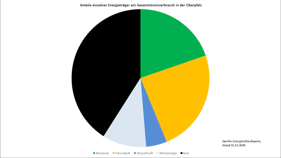 In der Oberpfalz konnte der Anteil der Erneuerbaren Energien am Gesamtstromverbrauch in den letzten Jahren erheblich gesteigert werden. Mit einer Produktion von 3,6 TWh bezieht der bayerische Regierungsbezirk nunmehr 59 Prozent seines Stromverbrauchs aus Regenerativen Energien. Dies bedeutet innerhalb von zwei Jahren einen Anstieg um fast 10 Prozentpunkte. Im Bayernvergleich liegt die Oberpfalz damit über dem Durchschnitt von 53,5 Prozent an zweiter Stelle – nur in Niederbayern ist der Wert höher.