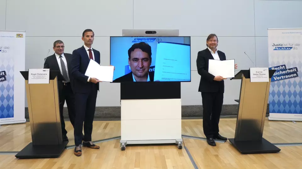Bayerns Justizminister Georg Eisenreich hat am 22. Juli zusammen mit Rogér Pellemans, Director National Security der niederländischen Forschungsgesellschaft TNO, und dem Wiener Komplexitätsforscher Prof. Dr. Stefan Thurner, Präsident des Complexity Science Hub Vienna (CSH), eine Kooperationsvereinbarung im Münchner Justizpalast unterzeichnet. Die Wiener Spitzenforscher steigen damit in das Erfolgsprojekt „Dark Web Monitor“ ein.