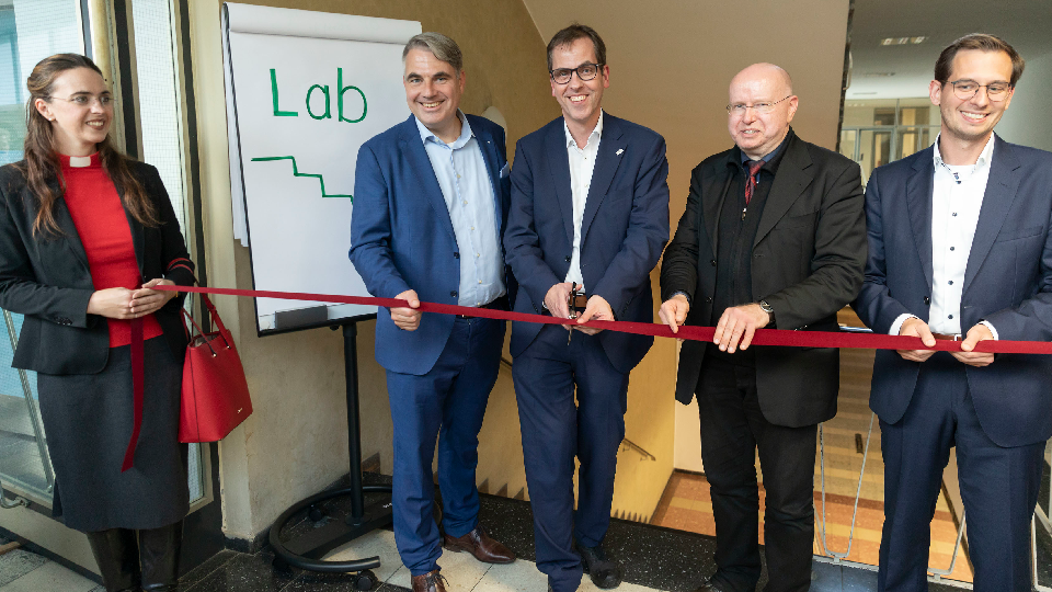 Offizielle Eröffnung des Start-up-Labs der OTH Regensburg (v.li.): Pfarrerin Dr. Gabriele Kainz, Prof. Dr. Sean Patrick Saßmannshausen, Leiter des Start-up-Centers, Präsident Prof. Dr. Ralph Schneider, Stefan Krabatsch, Staatliches Bauamt Regensburg, und Sebastian Kammann vom Projektträger VDI Technologiezentrum GmbH.