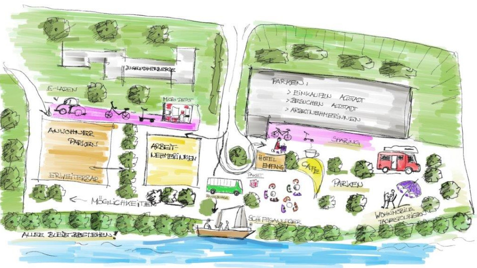 Visions-Skizze von Tanja Flemmig: So könnte die Mobilitätsdrehscheibe am Unteren Wöhrd künftig aussehen.