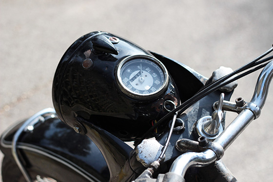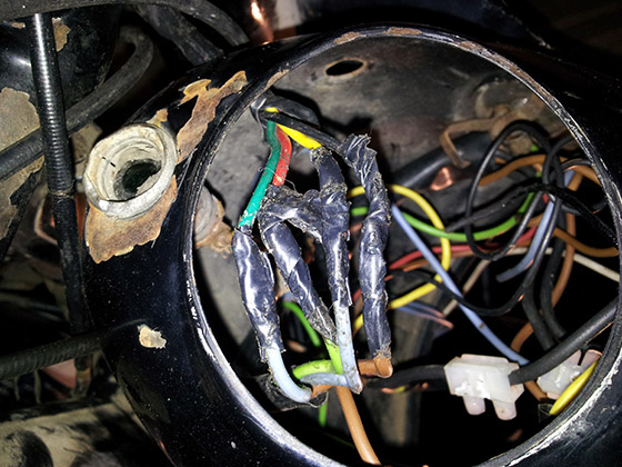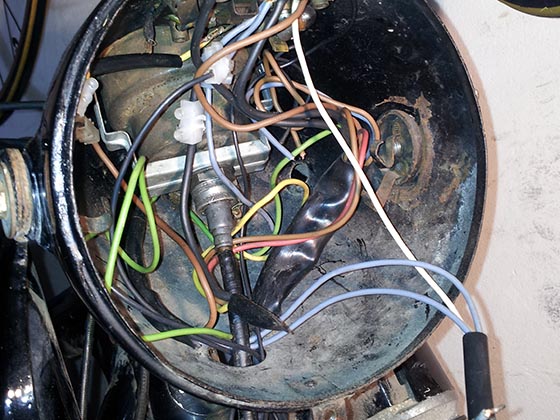 Beginnen wir also den Striptease! Womit fangen wir an? Die Auspuffanlage und der Tank fehlen sowieso schon. Nehmen wir daher den höchsten Punkt in Angriff: den Schweinwerfer. Woher diese massive Beule unterhalb der Neutralanzeige kommt, ist nach einem halben Jahrhundert nicht mehr nachvollziehbar. Auch an der seitlichen Halterung befindet sich eine Welle im Blech und oben in der Nähe des Tachogehäuses sind kleine Beulen. Der Lampenring samt Glas ist hier schnell demontiert. Hinter dem Glas verbirgt sich ein nettes Kabelgewirr. Stückwerk vom feinsten. Die Kabel wechseln alle paar Zentimeter, verbunden durch Lüsterklemmen oder Lot. Die Farbe, wahrlich ein schöner Regenbogen. Da sind Kabel ohne Anschluss zu sehen und beim Durchmessen finden sich ebenfalls am Fahrzeugende solche Kabel. Der elektronische Lichtmaschinenregler, der den Ladestrom für die Batterie einstellt, sitzt dort, wo normalerweise die Hupe sitzen sollte. Hier hängt stattdessen ein abisoliertes Kabel neben dem Kabelbaum. Das muss dringend erneuert werden!