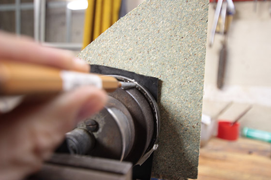 Nun sollten die Speichen auf Spannung gebracht werden. Aber immer nur ein bisschen, rundherum. Dann trimmt man den Höhenschlag heraus, anschließend n den Seitenschlag. Um die 1mm genau sollte das werden. Am Schluss machen Sie noch eine Klangprobe, die Speichen sollten alle möglichst ähnlich klingen, denn das bedeutet, dass sie den gleichen Zug haben. Versuchen Sie beim Zentrieren die Chromnippel unverkrazt zu lassen (Gewebeband in den Maulschlüssel kleben) und ziehen sie nicht zu viel an. Das geht locker aus dem Handgelenk. Am Ende schauen Sie noch in die Felge, wo später das Felgenband liegen wird. Spitzen dort Speichen aus den Speichenippeln heraus, sollten Sie den Überstand dringend entfernen. Das kann durchaus vorkommen, da die Nabenlöcher von den Speichenköpfen ausgeleiert werden oder auch Rost die Durchführung in der Felge vergrößert hat, sodass die Speiche sozusagen etwas zu lang wird. Eine „Zentriermaschine“ ist übrigens ebenfalls schnell selbst gebaut. Ein Stahlrohr mit dem Achsdurchmesser (oder eine der Steckachsen des Fahrzeuges selbst) kommt in den Schraubstock, eine Beilagscheibe und eine Rohrschelle fixieren das drehbare Rad auf der Achse. Da, wo die Felge an der Werkbank vorbeiläuft, wird einfach ein Bleistift aufgetaped. Die Felge wandert nun auf die Bleistiftspitze zu oder weg. Sie markieren eiernden Überabstand mit einem Stück Klebeband und ziehen die einen Speichen (wo die Felge hinwandern soll) ein bisschen an (z.B. die Speiche an der Problemstelle um ¾ Umdrehung, die nächsten nur 1/3) und die gegenüberliegenden werden genauso gelockert. Es werden immer mindestens 6-7 Speichen geändert, niemals nur die Speiche am Problempunkt! Es ist ein Zusammenspiel der dünnen Speichen, das den massiven Stahl der Felge in die richtige Lage bewegt.