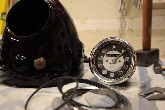 Wenn die Teile ordentlich und ausdauernd poliert werden, ist das Finish von dem einer Lackiererei nicht zu unterscheiden. Üben Sie, es macht wirklich Spaß! 2-Komponentenlacke sind teurer und härten schnell und chemisch aus, heutige 1-Komponentenlacke halten genauso gut, jedoch dauert es eben bisweilen lange, bis die Lösemittel endgültig ausgedampft sind und der Lack die gleiche Härte erhält.Am Tacho wurde der Zierring entfernt und ein neues Glas eingesetzt. Für ca. 20,- Euro erhält man dabei ein adäquates Reperaturset, bei dem auch ein (für uns aber nicht verwendbarer) Blendring dabei ist. Normalerweise wird der Chromring von einer dosenöffnerähnlichen Maschine gebördelt. Es funktiert aber auch wunderbar, wenn man den Ring aufsteckt, den Tacho in den Schraubstock leicht einspannt (Gummiunterlage drunter um den Ring nicht zu verbeulen, Foto), dem Ring eine Schlauchschelle anzieht und dann sauber und mit zarten Schlägen die Kante Stück für Stück auf die Tachonut schlägt. Den schwarzen Scheinwerferzierring zu restaurieren lohnt sich nicht. Ein solcher Chromring kostet zwischen 20,- und 50,- Euro, je nach Anbieter. Besser sieht es eigentlich in schwarz aus! Aber wir arbeiten ja Richtung Orginal-Look. Leider bröselt mir da auch gleich die gesamte Dichtung des Schweinwerfers zum Scheinwerfertopf entgegen. Hart wie alter Teer verteilt sich das Zeug am Teppich. Erst mal liegen lassen. Sie erinnern sich: Männerzone. Der Gummiersatz kostet 5,- Euro. Nicht nur der Gummi bröselt, sondern auch der Reflektor des Scheinwerfers. Der untere Bereich hat Wasser abbekommen und fröhlich weht es Flocken durch den Raum. Auch hier sind je nach Originalität zwischen 20,- und 50,- Euro fällig. Nach einigen Tagen sind endlich alle Teile da und die Montage ist eine wahre Freude.