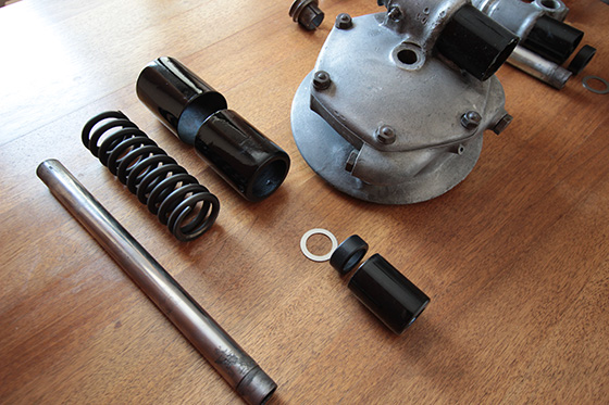 Richtig! Die Gabel ist noch mit Gummimanschetten bestückt. Das will noch rückgerüstet werden. BMW hat die Manschetten als Upgrade gemacht, geschützt vor Schmutz und Witterung hält die Gabel eben wesentlich länger. Aber da ich wenig fahre und mir die Manschetten gar nicht gefallen, kaufe ich mir einen Satz der nötigen Teile zum Wechsel. Dabei sind die oberen Federaufnahmen zu tauschen, sowie die Blechhülsen zu besorgen. Unten sind die gelieferten Teile mit den vorig montierten gleich... nur als Tipp. Für alles zahle ich gebraucht 140 Euro. Also noch mal strahlen und lacken, aber das ist es mir Wert. Und siehe da – es hat sich rentiert.
