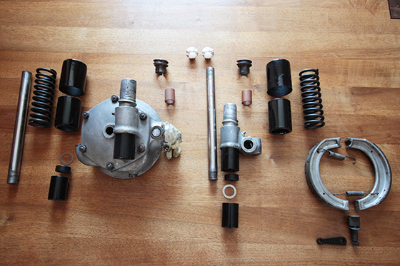 Im Keller werden nun Federn und Hülsen zerlegt. Zunächst einmal muss alles Fett aus 50 Jahren weg, das da verhärtet, verdreckt, in Klumpen, schmierigen Brocken und schleimigen Ergüssen klebt. Dabei zeigt sich wiedereinmal, dass Klopapier und Tageszeitung zwei unglaublich wichtige Begleiter sind, wenn es darum geht, Schmutz aufzunehmen: billigster und bester Weg. Dazu gibt es wie immer einen Doppelten an Bremsenreinger und der Abend beginnt beschwingt zu AC/DC aus dem Radio.