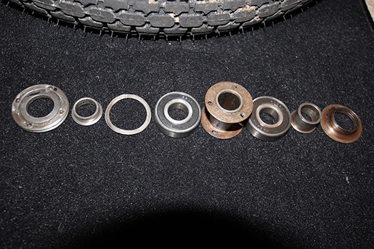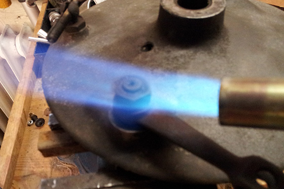 Bei den ersten Maschinen war auch nur eine Simplex-Bremsanlage verbaut. Das heißt, ein Seilzug dreht einen Bremsnocken, welcher dann die Beläge spreizt. Später wurde eine Duplexanlage verbaut, die über zwei drehende Bremsnocken verfügt. Auch diese Teile entfernen wir aus der Nabe. Freund Fauch - unser Gasbrenner - hilft auch hier nach kurzem Erwärmen eine verrostete Mutter ohne Gewalt vom Bremsnocken zu lösen.
