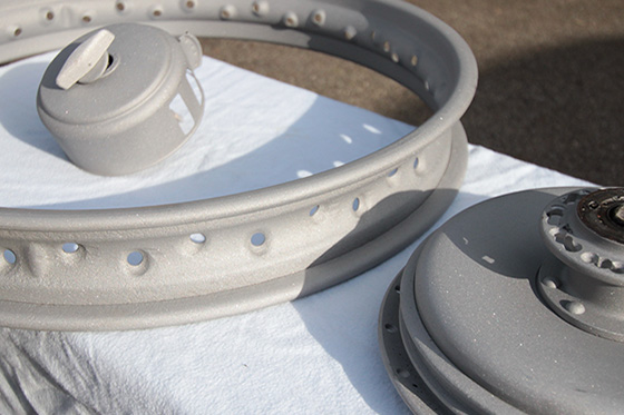 Die Felgen sind aus Stahl, die Naben aus Guss, die Luftfilterkappe, die wir gleich mitreinigen lassen, ist aus Blech. Hier kommt daher Korund zum Einsatz. Da wir die Lager in den Achsen gelassen haben, müssen diese gut abgeklebt werden um „Sand im Getriebe“ zu vermeiden.