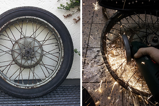 Nun könnte man mühevoll versuchen, den Lack abzuschleifen. Schicht um Schicht. Jedoch hat die Nabe viele Rillen und die Felgen sind rauh und oberflächlich angerostet. Der rotbraune Kamerad wäre nach ein paar Monaten Abstinenz wieder zurück und würde den Lack von unten aufblühen lassen.