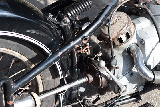 Normalerweise sitzt ein mechanischer Regler im Motorgehäuse, der mit einer früheren Batteriearchitektur perfekt dazu geeignet war, die kochende Säure munter Tag für Tag am Rahmen runterlaufen zu lassen. Viele Maschinen haben dort deshalb etwas (oder auch mehr) Fraß am Querrohr, an dem der Fahrzeughauptständer montiert ist. Der Rahmen ist jedoch massiv und einfach instand zu setzen. Also kein Problem. Ich fotogtafiere und notiere vorsichtshalber die Kabelanschlüsse aber der neue Kabelbaum ist bereits bestellt (55,- Euro). Ebenso ein elektronischer Laderegler, der anstelle des mechanischen im Motorgehäuse verbaut und verkabelt wird (50,- Euro).Fußschaltung war damals neu, es musste lange Zeit ein zusätzlicher Schalthebel zur Handbedienung vorhanden sein! Kriegs-und Vorkriegsmodelle hatten diese Schaltung am Tank montiert. Das sah fantastisch aus.