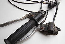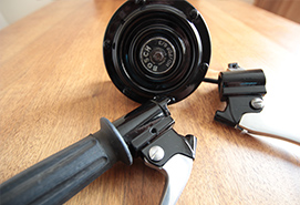 Nun werden noch neue Gummigriffe am Lenker verbaut. Bremsreiniger ist hierbei mein Lieblingsmittel. Den gibt es ja in Riesensprühflaschen für drei Euro und er reinigt einfach alles oder hilft wie hier beim Aufschieben des Gummigriffes eine schmierende Zwischenschicht zu bilden, welche rückstandslos wieder verschwindet. Nimmt man zum Beispiel Spülmittel, so wird der Griff nie halten und wenn es nass wird schon gleich gar nicht mehr. Auch Feuerzeugbenzin bietet sich hier an, aber ein ordentlicher Spitzer Bremsreiniger direkt in den Griff so, dass es unten steht und dann aufschieben - ist einfach die beste Lösung.