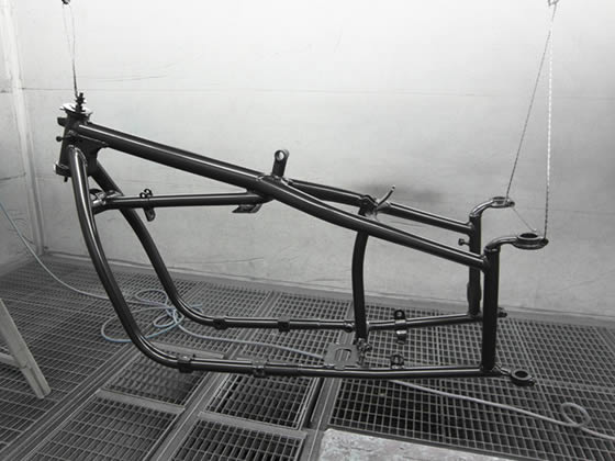 Es sieht aus, als wäre es hellgrau bis weiß grundiert. Dann wird der Rahmen in die hauseigene Lackierkammer gebracht und grün geduscht. Je weniger Zeit zwischen Strahlen und grundieren ist, desto weniger kann auch oxidieren, sprich rosten. Gerade bei Rahmen ist das besonders wichtig, soll er doch die nächsten 50 Jahre frisch bleiben. Hiermit sind dafür die besten Voraussetzungen gegeben. Nach einem Tag durchtrocknen holen wir die grüne Lady ab. Das schwarze Makeup hat vorher alles verdeckt was die Zeit in den Rahmen geritzt hat. Erfreulicher Weise finden wir keine Beulen, Risse oder sonstig markante Narben. Man könnte meinen, er wäre neu vom Werk.