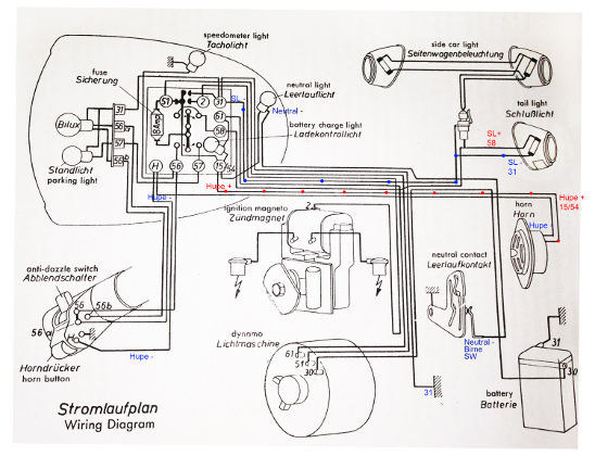 56 an der Platine gibt, wenn der Zündschlüssel auf an gedreht ist, Strom an das Tacholicht und an den Schalter am Lenker links, dieser wählt dann zwischen Abblend- und Fernlicht und führt dann zur jeweiligen Birne. Man muss also nur rausmessen, welches der vier Kabel von der Lenkradarmatur bei befestigtem Schalter (und ohne Lack am Kontaktpunkt) auf Masse schließt wenn der Hupknopf gedrückt wird, dieser wird dann mit dem Kabel das zum Minus der Hupe führt verbunden. Von den restlichen dreien ist nur eines immer mit einem der anderen verbunden (egal wie der Lichtschalter gelegt wird), das eine ist dann mit 56 zu verbinden, das bringt Strom. Die anderen werden mit dem jeweiligen Kontakt an der Lampenfassung verbunden. Die Erdung der Birnenfassung geht an – Sie wussten es – 31.