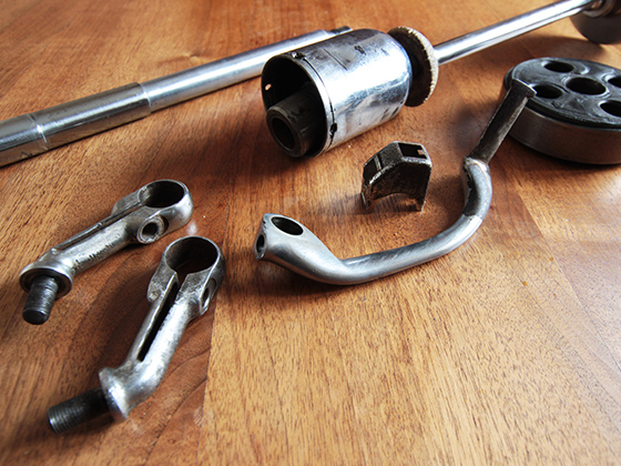 Und da zeigt sich gleich das nächste Problem bei der Bremse. Ein Nocken, bei BMW Bremsschlüssel genannt, wird durch das Bremsgestänge (bei Vespas durch ein Seil) angesteuert und gedreht und spreizt die Backen in und an die Trommel. Dieser Nocken zeigt deutliches Spiel, was entweder bedeutet, dass die Führung, also das gesamte Kardangehäuse, ausgeschlagen ist oder der Bremsschlüssel, also die Achse, die im Kardangehäuse gelagert ist, abgenutzt ist. Gott sei dank ist es letzteres. Das erfahre ich aber erst, als ich auf gut Glück einen gebrauchten (neuwertigen) Bremsschlüssel für stolze 40 Euro zugesandt bekomme. Vorne am Pedal ist ähnliches Spiel. Pedal und Gestänge werden zusammen in der Bucht für 130 Euro aufwärts gehandelt. Das behalten wir uns erst einmal für später vor, so abgenutzt wie das Pedal aussieht, ist es zweimal um die Welt gekommen. Das Spiel an sich ist kein Problem, jedoch führt es eben zu einem ungenauen Ansprechen der Bremse und einem erhöhten Leerspiel, bevor die Backen in Aktion treten.