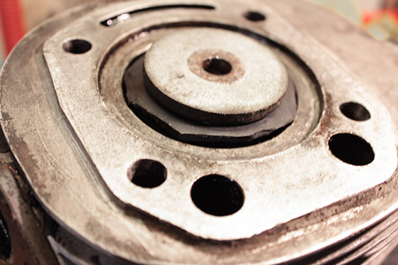 Eine dicke Gummischeibe und eine Beilagscheibe passen in den Brennraum. Der Gummi soll die Ventile schützen. Jetzt fixieren wir den Kopf auf der Werkbank. Um die Ventilfedern usw. auszubauen, müssen wir von oben auf den Ventilteller drücken. Das Ventil muss dabei stehen bleiben, was durch die Gummi- und die Beilagscheibe im Brennraum erzielt wird.