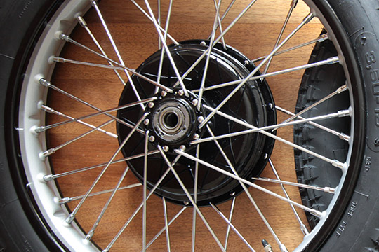 Nach einigen Tagen Aushärten beginnt das Einspeichen. Im Prinzip ist es wirklich nichts anderes, als eine Fahrradfelge einzuspeichen. Wer weiß, wie er einen Achter und einen Höhenschlag aus der Felge zieht (und dabei mit gleichmäßiger Spannung und Entspannung beteiligter Speichen umgeht), der kann das auch am Motorrad in aller Ruhe und mit Genuß selbst machen.