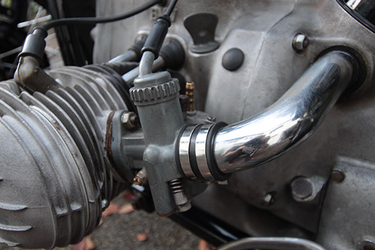 Zeit, den ersten Kick zu machen. Ins Freie geschoben, die Sonne scheint kurz. Benzinhahn auf, Vergaser antupfen (dabei werden sie tiefer gedrückt und etwas Sprit läuft direkt durch den Gaser in den Ansaugtrakt). Drei Kicks und es bollert. Der Berg bebt. Tief. Was ein schöner sonorer Klang. Massiv und dumpf. Ich bekomme Gänsehaut, denn ich habe noch keine so alten Boxer laufen hören. Sie tuckert vor sich hin und am Gas dreht sie bereitwillig hoch. Dann auch auf zwei Zylindern. Im Standgas jedoch, bis Sie warm ist, will nur ein Zylinder seinen Dienst verrichten.