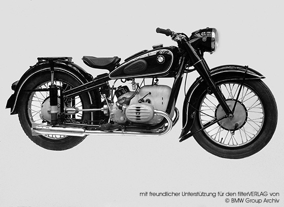 Bild: Schwarz/Weiss BMW R51/3 Modelljahr 1951, Gabel mit Blechverkleidung, Foto ©BMW Group Archiv