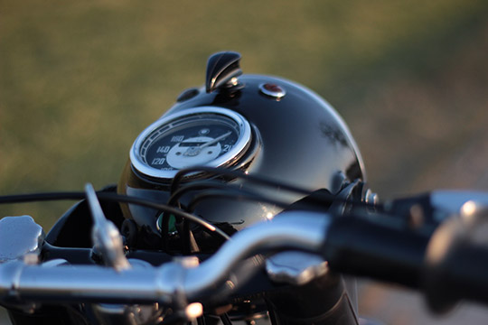 Wir montieren nun feierlich den tropfenförmigen Tank. Zu beachten sind dabei vorne oben am Rahmen die Feingewinde(!) schrauben. Der Tank wird eingehängt und dann wird noch eine Art Haken eingeschraubt, der den Tank am zweiten Rahmenrohr von oben abstützen könnte. Da er das bei mir nicht tut, ergänze ich 5 Millimeter mit einer kleinen Gummimatte. Dann wird er hinten und vorne verschraubt und sitzt perfekt. Der Sattel entspringt in der Mitte des hinteren Tankendes, auch hier sind pro Seite nur zwei Millimeter Platz für Bolzen und Schrauben – das macht die feine Optik aus. Die Kniekissen lassen sich am besten mit Spüli eingerieben auf die Bleche am Tank aufziehen. Dies ist häufig eine Schadstelle an den Tanks, da diese zum Rosten neigen. Da sitzt gerne die Feuchtigkeit und arbeitet sich mit Staub und Dreck zum Metall vor.