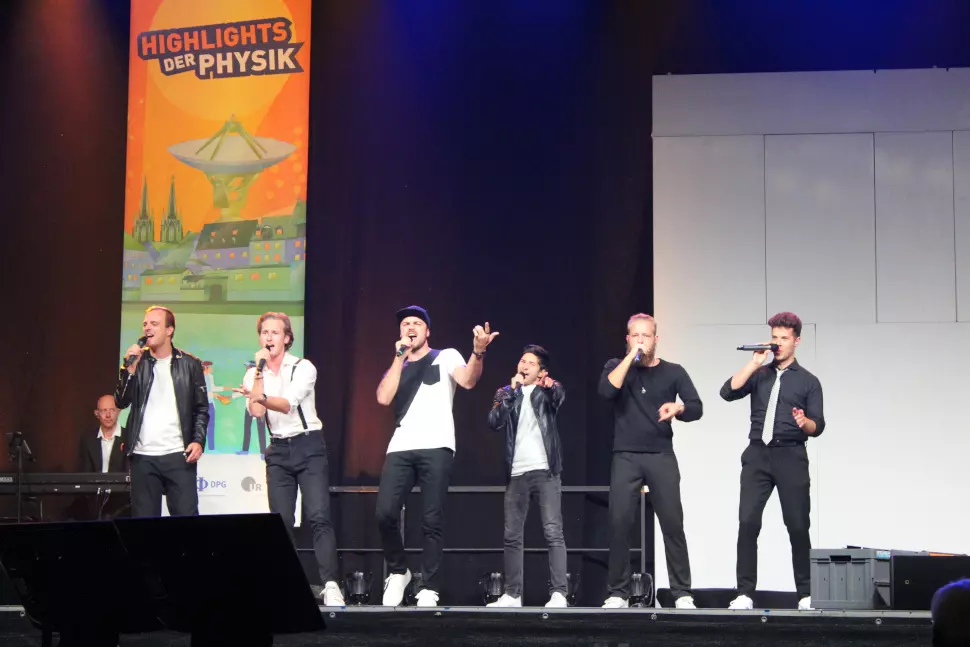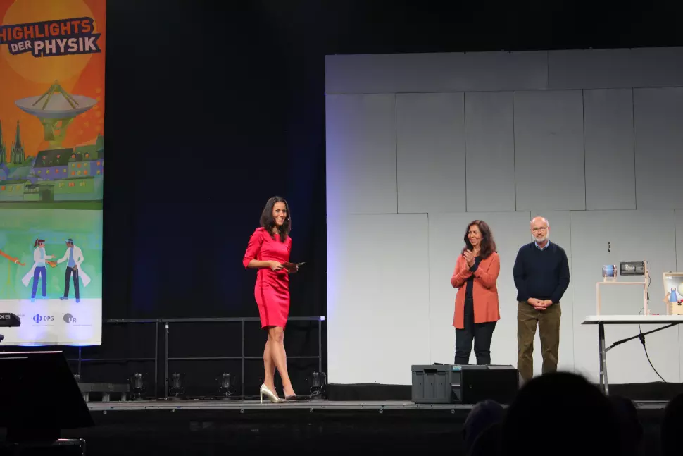 Die voll ausgelastete Donau-Arena bot den Zuschauern eine große Bühne mit Band und zwei großen Leinwänden, die das Geschehene auf der Bühne nochmal in Nahaufnahme zeigten, sodass auch die hintersten Gäste sehen konnten, was vorne geschah: Eine multimediale Installation, die mit einer historischen Aufnahme des Physikers Max Planck begann. Kurz darauf wurde der erste Teil des Events von der Moderatorin Dr. Angela Halfar eingeleitet. Sie führte die Zuschauer von dem griechischen Philosophen und Denker Demokrit über Max Planck, Albert Einstein und Nils Bohr in die heutige Welt der Physik ein. Die Moderatorin gab dann zu verstehen: „Niemand von den Physikern wusste, was man aus den Erkenntnissen, die sie erlangt haben, später machen würde. Sie betrieben Grundlagenforschung für die heutige Welt.“
